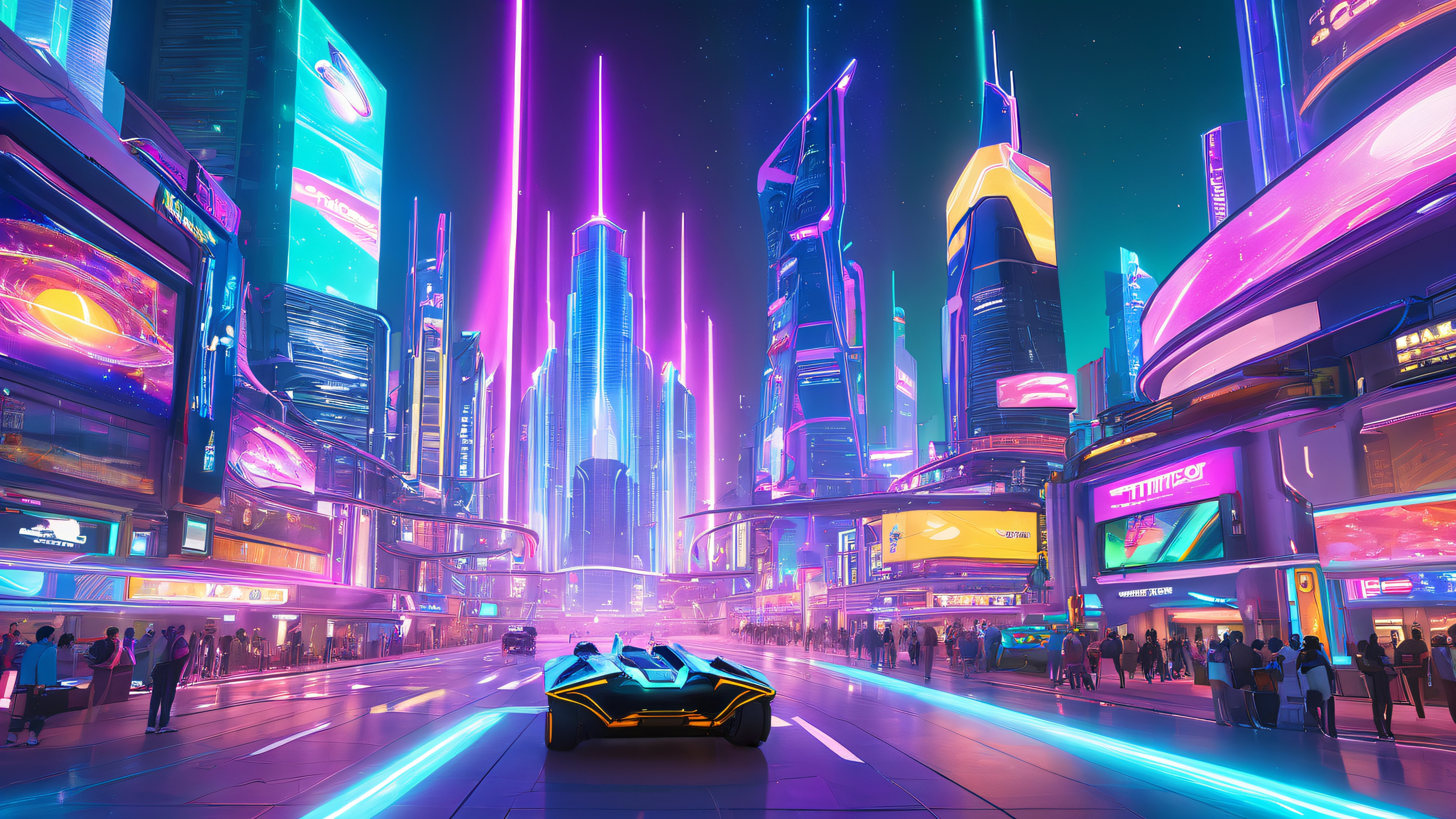 A futuristic metropolis teems with life, as sleek skyscrapers and vibrant streetlights reflect the fluid movements of iconic characters. LED billboards pulse with energy, while hovercraft hum in the distance, setting the tone for a city that’s alive and electric.