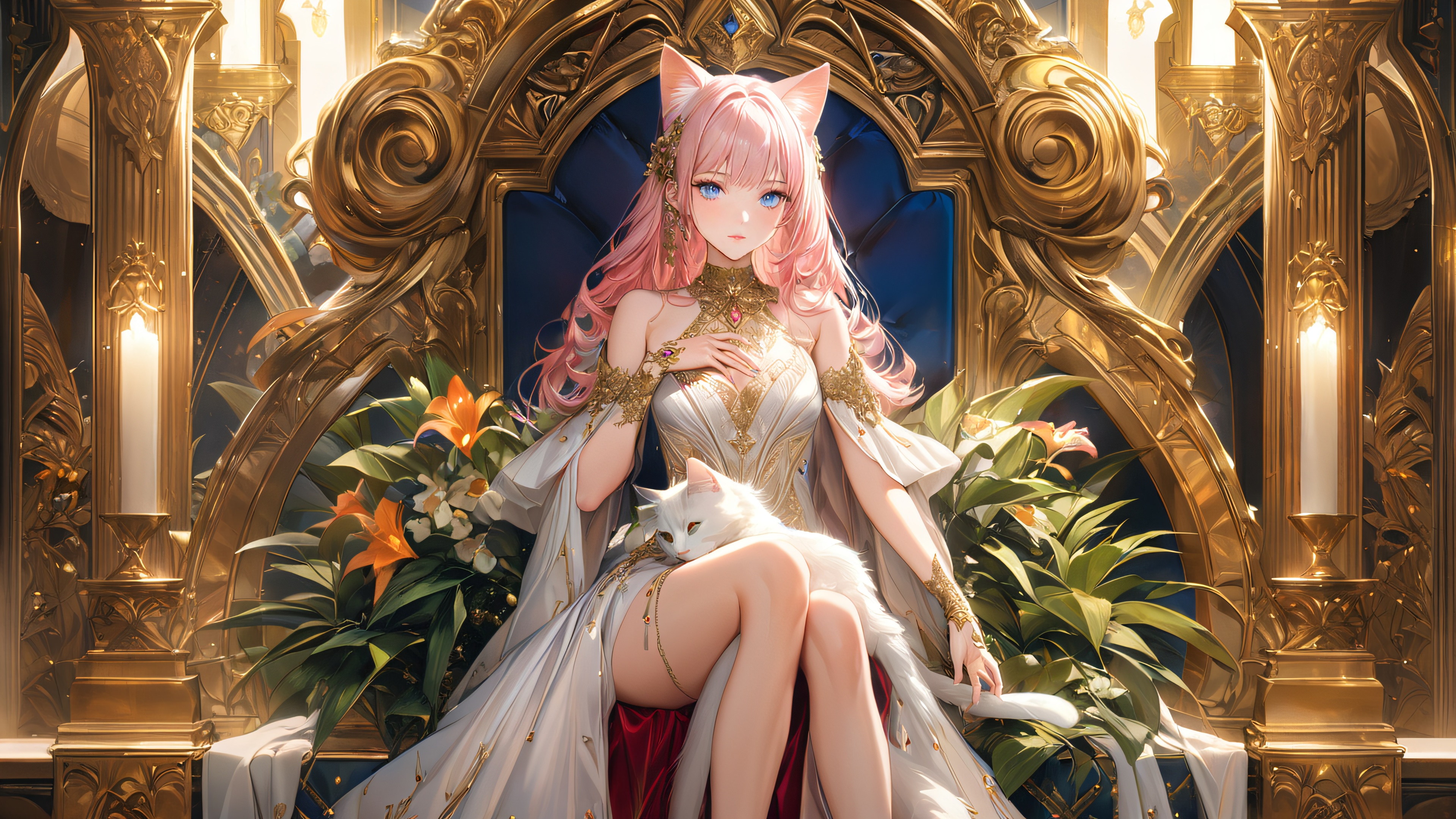 In this stunning anime-inspired illustration, a majestic white cat with piercing blue eyes poses regally on a velvet-covered throne. The lush tropical garden surrounding the throne features vibrant pink and orange flowers, creating a serene atmosphere. Soft candlelight casts warm highlights on the cat’s fur, while subtle hints of ambient moonlight add depth and mystery.