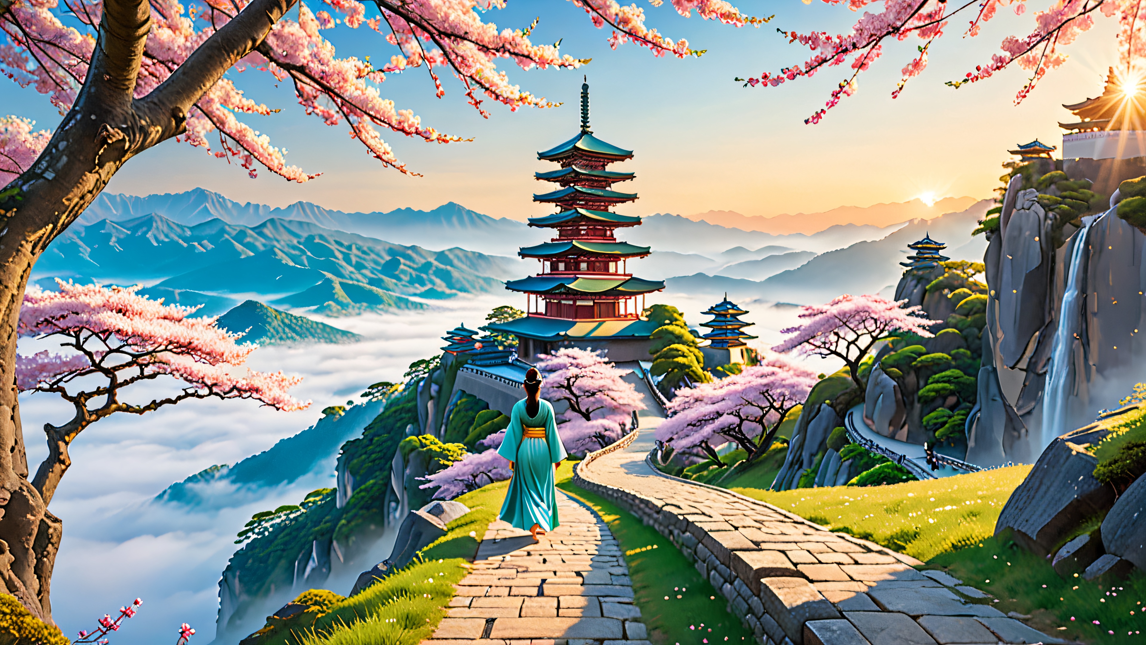 Epic Sakura Temple Dawn 4K Desktop Wallpaper Free Download: