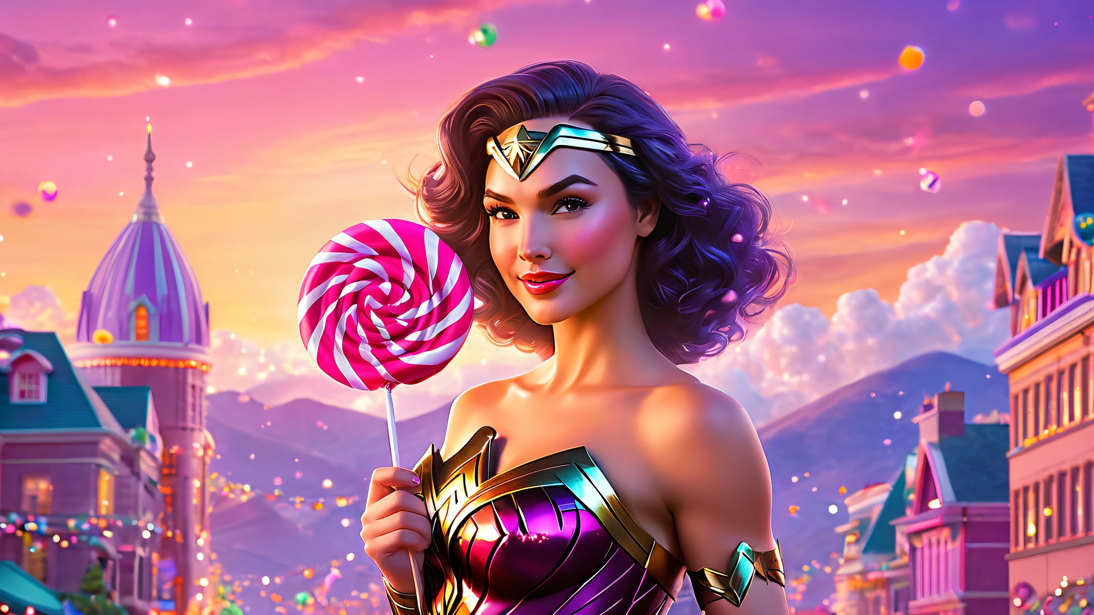 This vibrant 4K desktop wallpaper features a stunning, hyper-realistic illustration of a young warrior princess with short, spiky hair and a mischievous grin, surrounded by a swirling vortex of purple and pink energy. She holds a cartoonishly oversized lollipop, as the fantastical cityscape behind her transforms into a sugary wonderland at sunset. Buildings made of candy canes, gumdrop trees, and giant marshmallow clouds stretch towards the sky, infused with a soft, warm glow reminiscent of a thousand tiny sparklers.