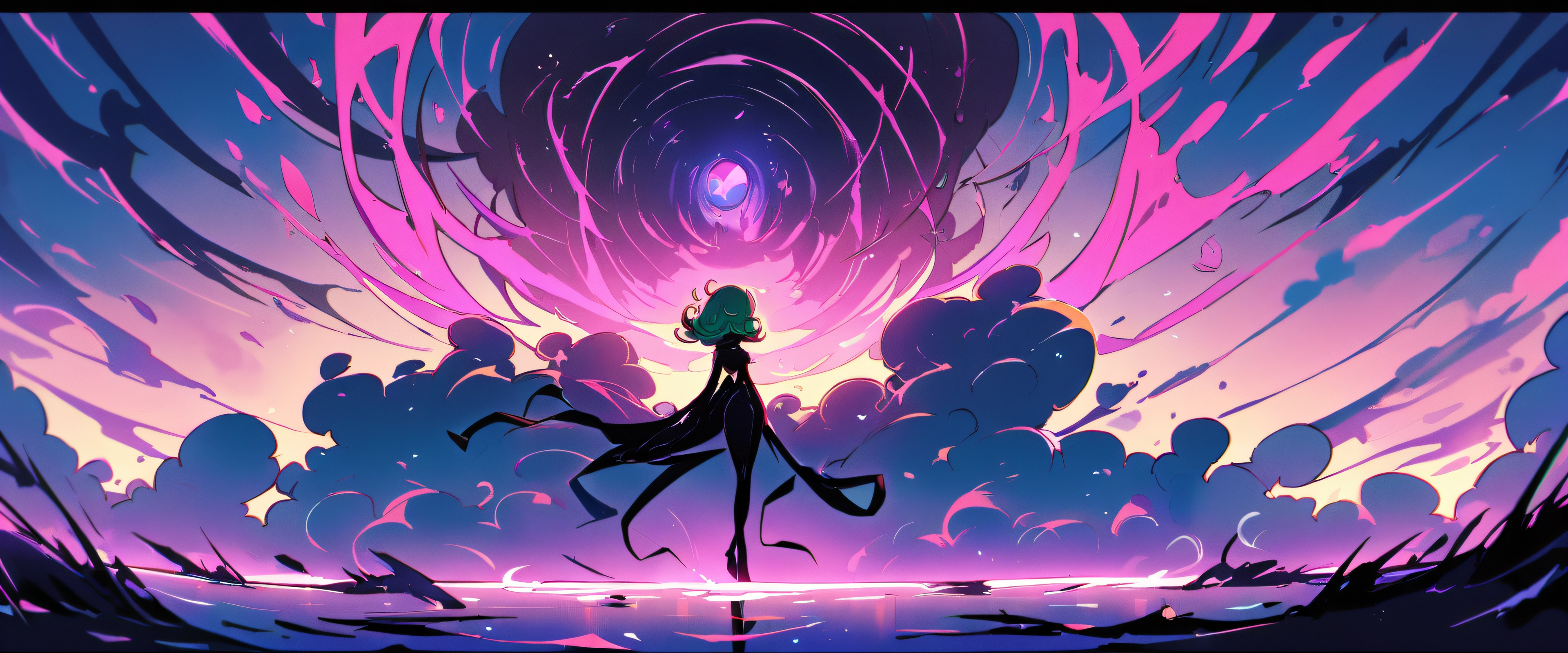 1garota, tatsumaki, one punch man, solo, obra de arte, melhor qualidade, muito estético, absurdos, altamente detalhado, olhando para o espectador, Limpe perfeitamente o vasto vazio puro, extrema profundidade de campo, [‘Gold’, ‘Black’], 21:9 proporção panorâmica ultralarga, plano amplo épico, claro e arejado, iluminação etérea, lindo céu, iluminação cinematográfica, cores vivas