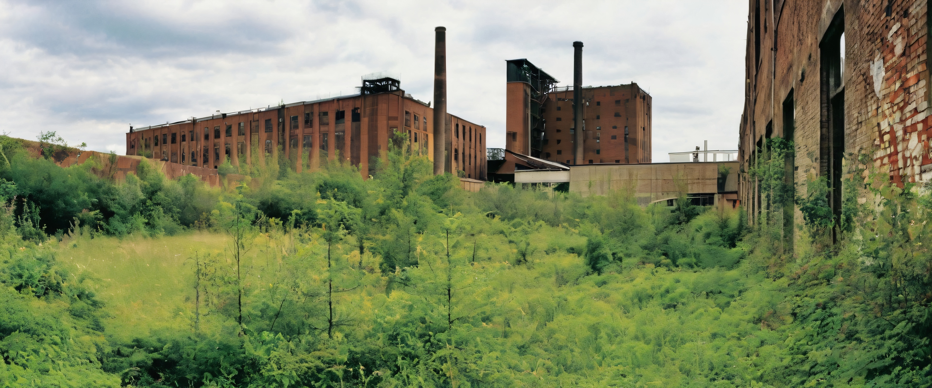This breathtaking 21:9 ultrawide panoramic wallpaper showcases a majestic, abandoned industrial complex in stunning high-contrast detail. The crumbling concrete walls, overgrown vegetation, and rusty pipes and machinery create a gritty, realistic atmosphere reminiscent of urban exploration. With its muted earth tones and subtle film grain texture, this masterpiece is sure to transport your desktop or PC to a world of decayed beauty.
