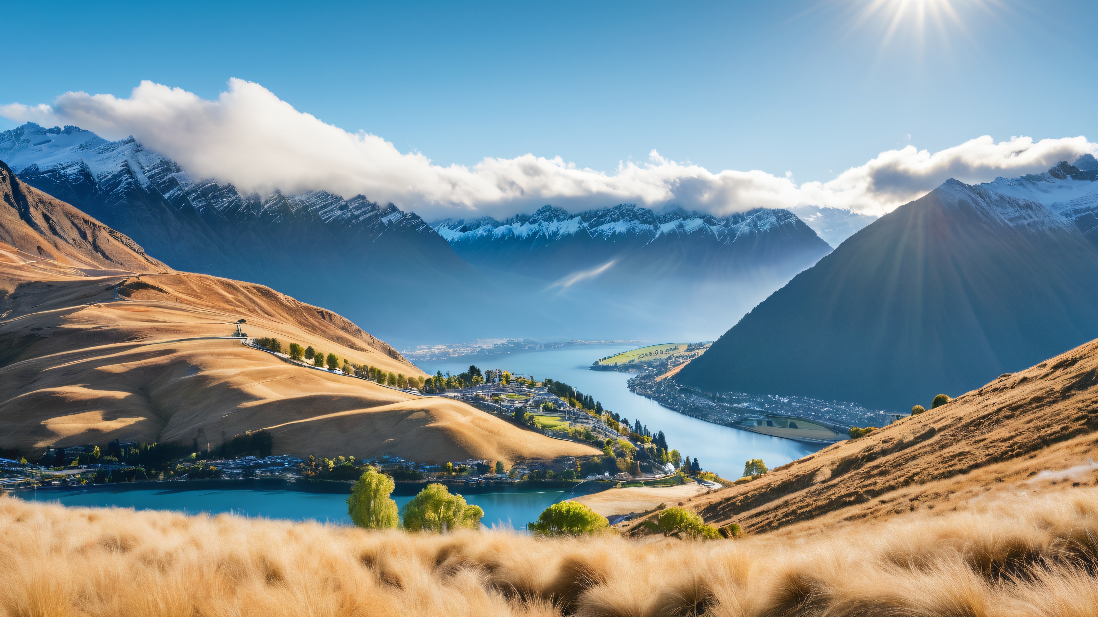 This breathtaking 4K wallpaper features a serene cloud-filled ridge overlooking the picturesque town of Queenstown, with the majestic Southern Alps rising up in the distance, their rugged peaks still capped with a dusting of snow. The sky is a brilliant blue with only a few wispy clouds scattered across it, allowing the sun to cast a warm glow over the entire scene. The tranquil mountainous valley is surrounded by lush greenery and towering trees, leading up to the cloud-covered ridge. The atmosphere is peaceful, with subtle effects of mist and sunlight casting long shadows across the landscape.