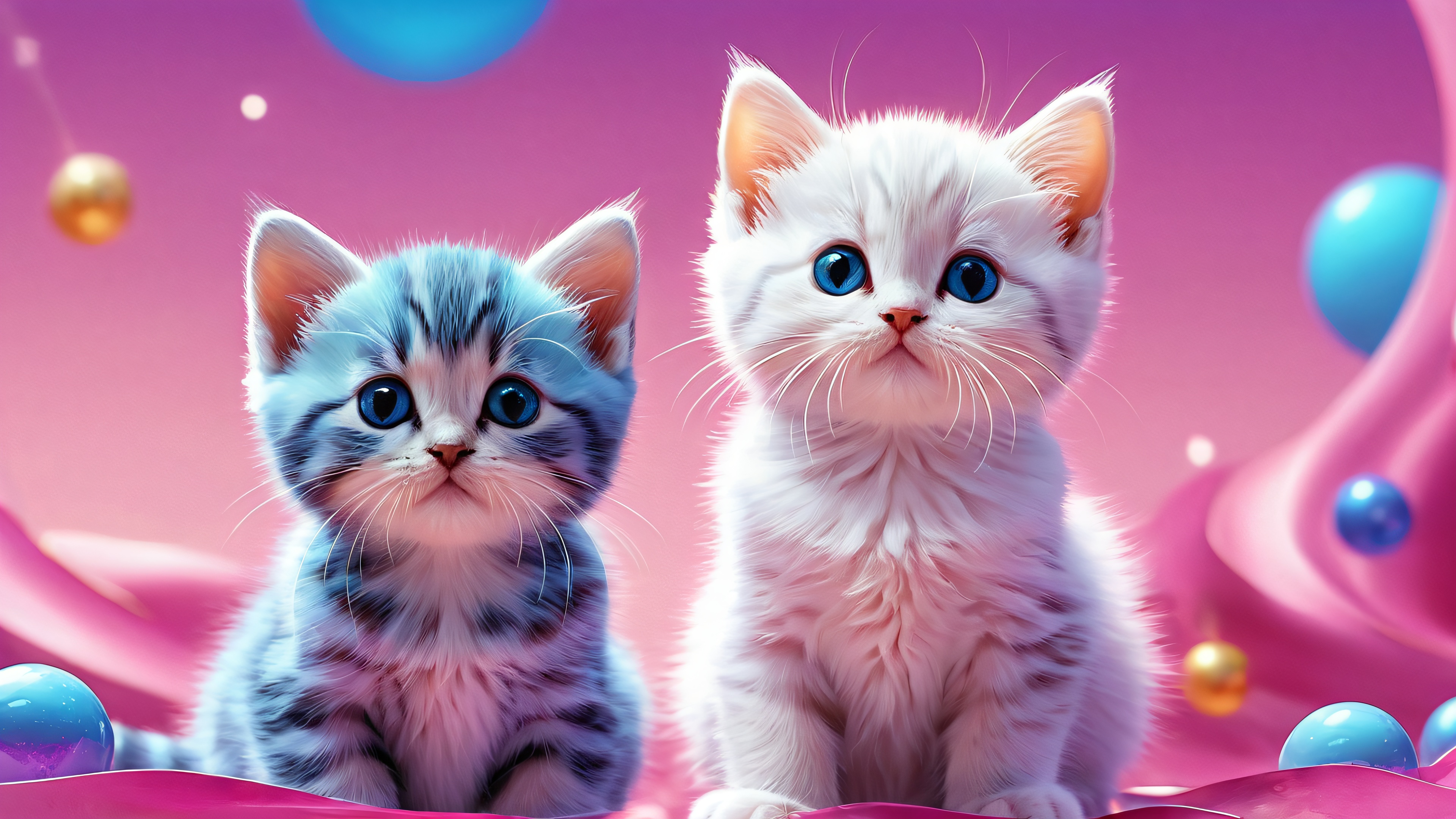 A breathtaking desktop wallpaper of Centered Animals (Cats), Perfectly clean vast pure void with extreme depth of field, Award-winning digital art, pristine clarity, Ethereal lighting with radiant brilliant colors, ray-traced reflections and pristine clarity. Bright and airy., #FF69B4 (Deep Pink/Purple) and #87CEEB (Soft Blue), 16:9 aspect ratio, ethereal lighting, radiant, brilliant colors, ray traced reflections, pristine clarity, award-winning digital art, epic breathtaking scale, stunning visual impact, perfect composition, highly textured surfaces, intricate micro-details, physically based rendering, macOS wallpaper aesthetic, masterpiece, highest quality, highly detailed, 8k resolution.