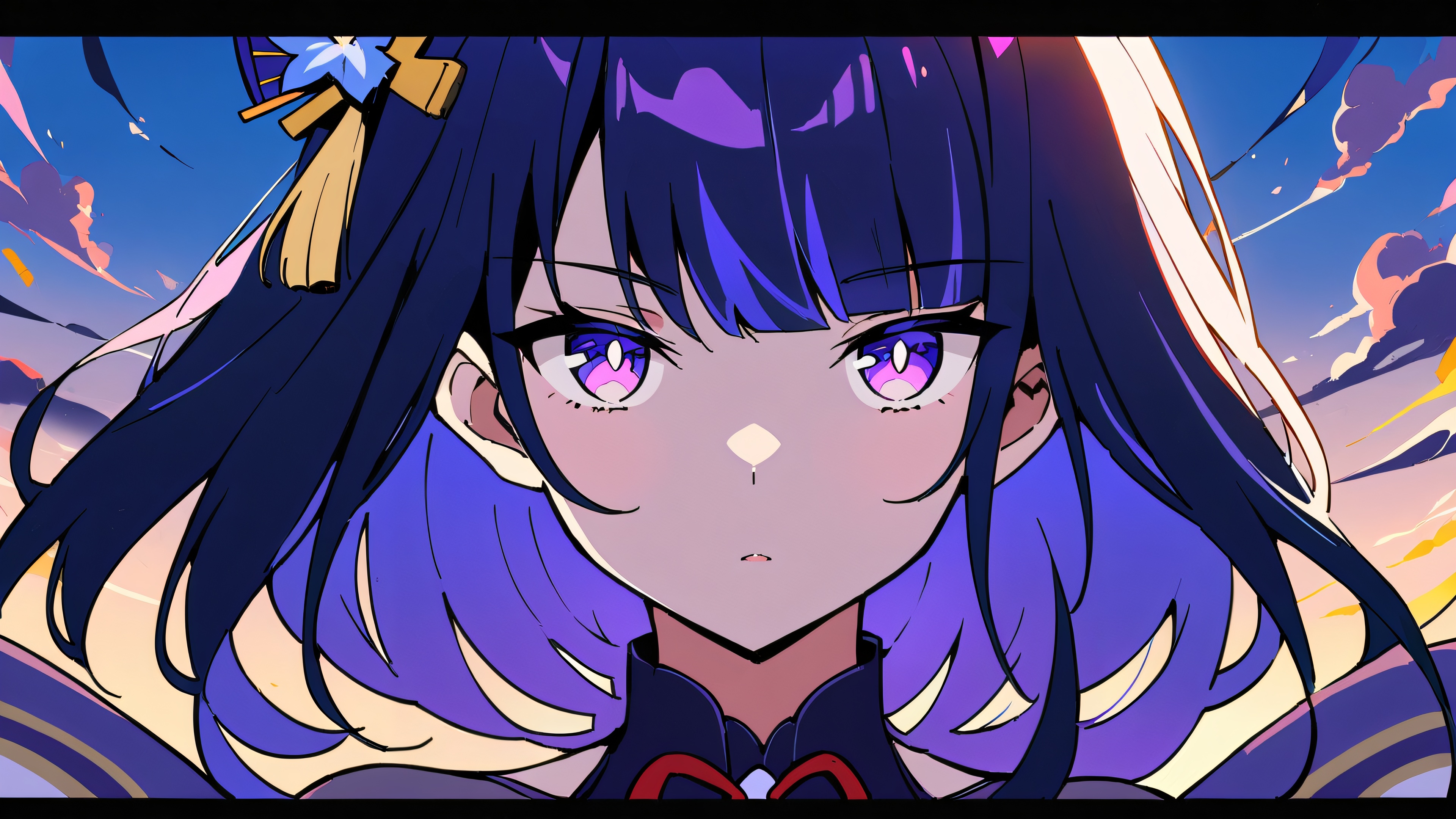 1girl, raiden shogun, genshin impact, solo, masterpiece, best quality, very aesthetic, absurdres, highly detailed, looking at viewer, Perfectly clean vast pure void, extreme depth of field, [‘Orange’, ‘Yellow’, ‘Red’], 16:9 aspect ratio, bright and airy, ethereal lighting, beautiful sky, cinematic lighting, vivid colors