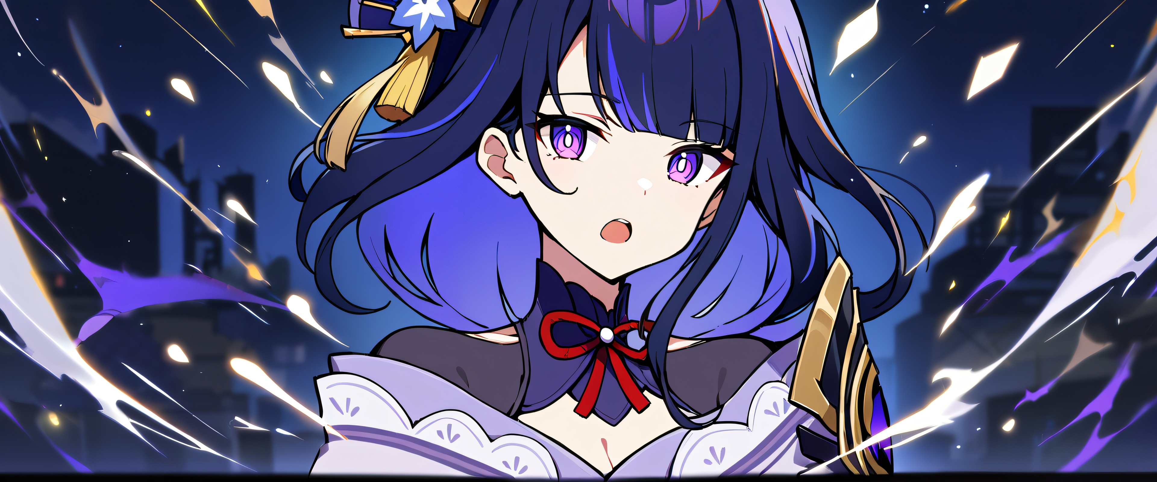 1girl, raiden shogun, genshin impact, solo, masterpiece, best quality, very aesthetic, absurdres, highly detailed, looking at viewer, Perfectly clean vast pure void with extreme depth of field, open mouth expression, [‘Sparkling whites’, ‘Bright whites’, ‘Deep blues’], 21:9 ultrawide panoramic aspect ratio, epic wide shot, elegant low-key lighting, striking contrast, deep perfect blacks, night scene, glowing lights, dramatic shadows