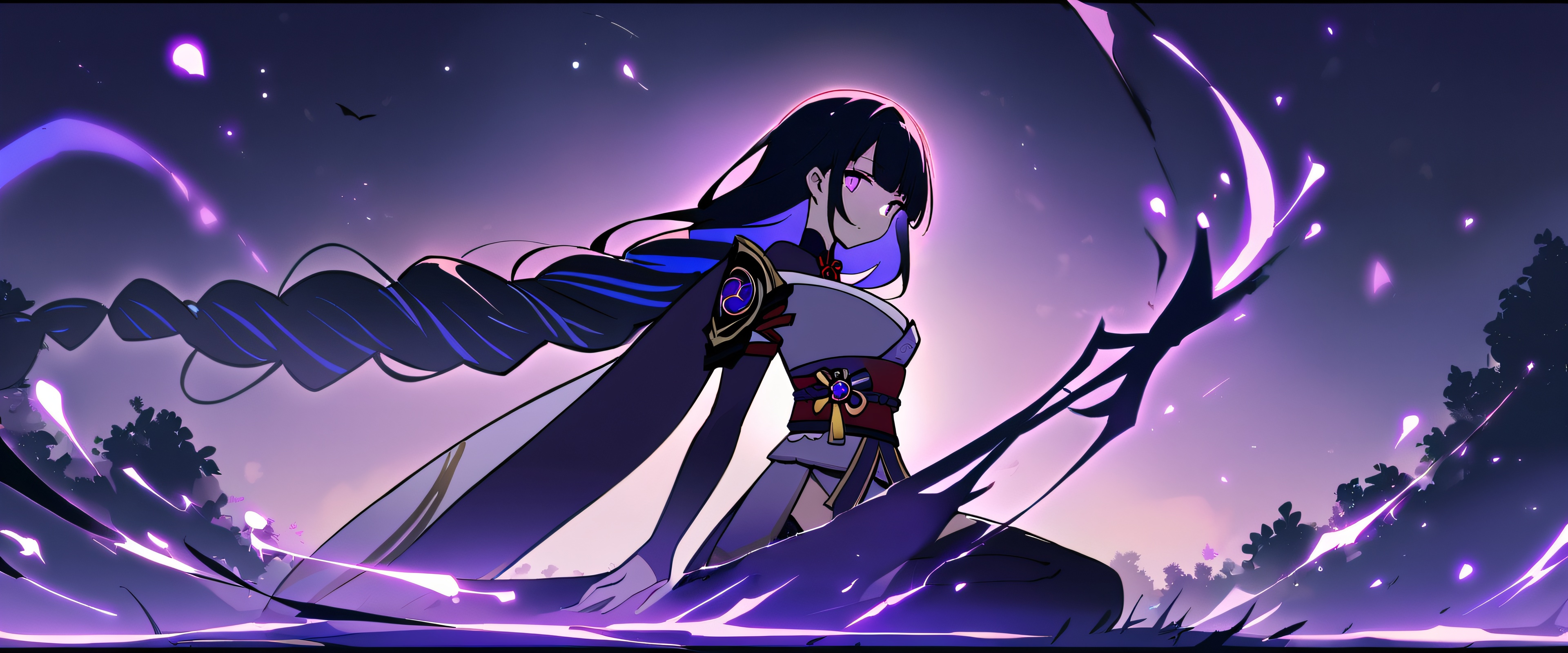 1girl, raiden shogun, genshin impact, solo, masterpiece, best quality, very aesthetic, absurdres, highly detailed, looking at viewer, A perfectly clean vast pure void, extreme depth of field, with subtle grass textures and a few strategically placed trees to create a sense of depth and tranquility., #FF69B4, 21:9 ultrawide panoramic aspect ratio, epic wide shot, elegant low-key lighting, striking contrast, deep perfect blacks, night scene, glowing lights, dramatic shadows