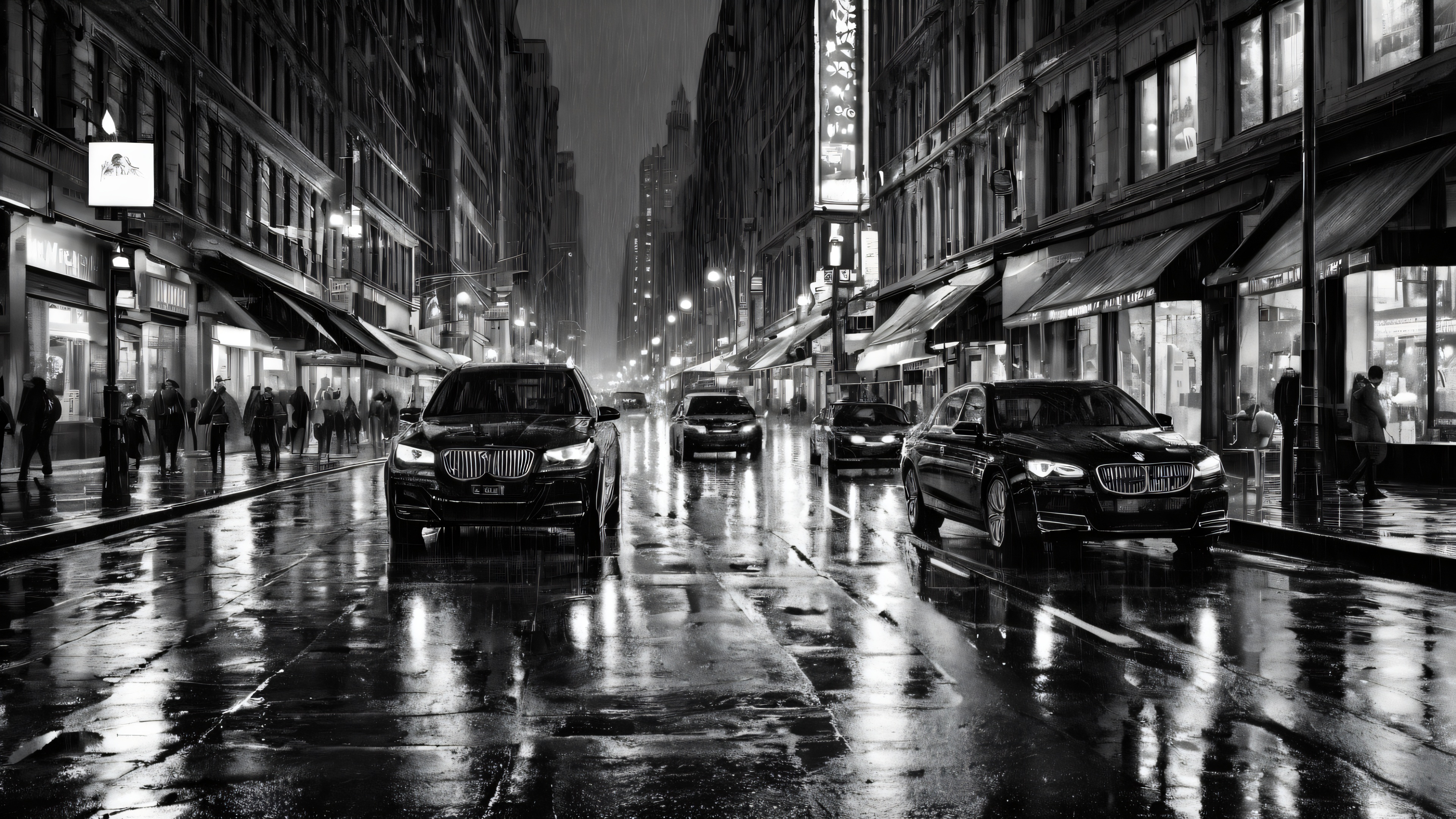 A breathtaking desktop wallpaper of Cinematic black and white rainy city street scene , epic desktop background, masterpiece, high quality digital art, radiant lighting, vibrant colors, 16:9 aspect ratio, ethereal lighting, radiant, brilliant colors, ray traced reflections, pristine clarity, award-winning digital art, epic breathtaking scale, stunning visual impact, perfect composition, highly textured surfaces, intricate micro-details, physically based rendering, macOS wallpaper aesthetic, masterpiece, highest quality, highly detailed, 8k resolution.