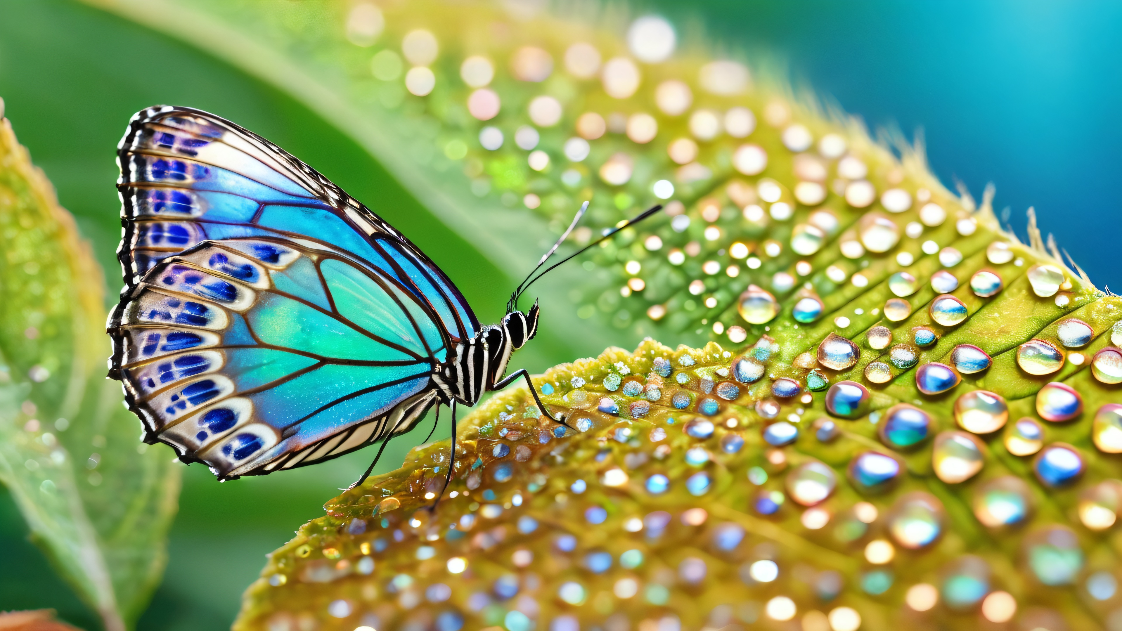 This breathtaking 4K desktop wallpaper features a rare iridescent butterfly’s wings in intricate detail. The microscopic patterns and structures reflect light in a mesmerizing display of colors and textures. The wings’ veins and microscopic hairs are visible, as if magnified under a microscope. A shallow depth of field blurs the lush green foliage and scattered dew droplets in the background, evoking a sense of serenity and peacefulness. Soft, golden light from the late afternoon sun casts a warm glow on the butterfly’s wings, highlighting iridescent blues, greens, and purples, with hints of gold and silver.