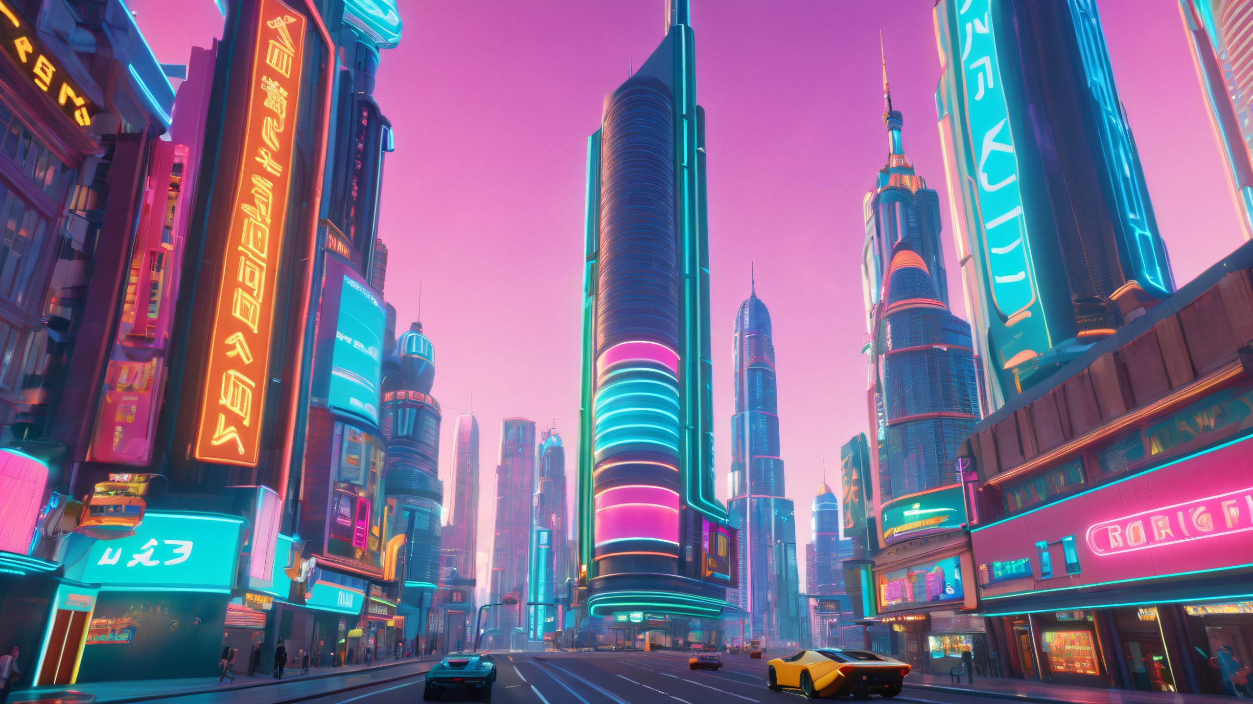 This stunning 4K wallpaper features a hyper-realistic, 3D-rendered cityscape with towering skyscrapers, retro-futuristic architecture, and a hint of cyberpunk flair. The scene is set in the midst of a bustling virtual reality metropolis, with holographic advertisements and virtual avatars swarming through the streets. The warm, golden lighting from holographic advertisements and cool, blue-green neon lighting from the city’s infrastructure create a visually striking contrast, evoking the nostalgic feel of classic 1990s CGI animations.
