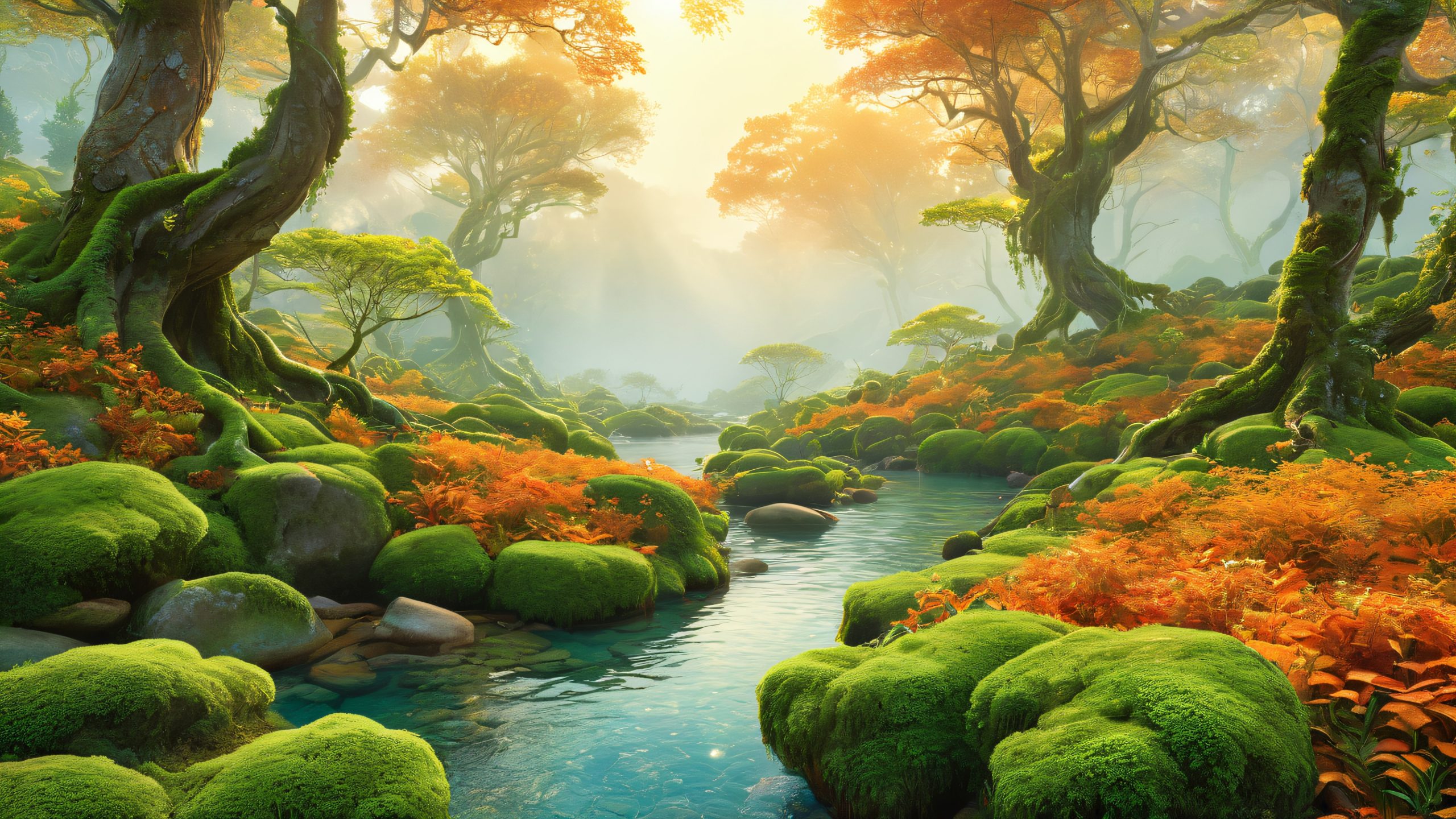 A serene and mystical forest landscape unfolds, where towering trees, veiled in mist, stretch towards the sky. Intricate textures and subtle shading bring this hyper-realistic scene to life, as if plucked from a fantasy novel’s cover art. Earthy tones dominate, punctuated by bursts of fiery orange and crimson, echoing the magic that lies beneath.