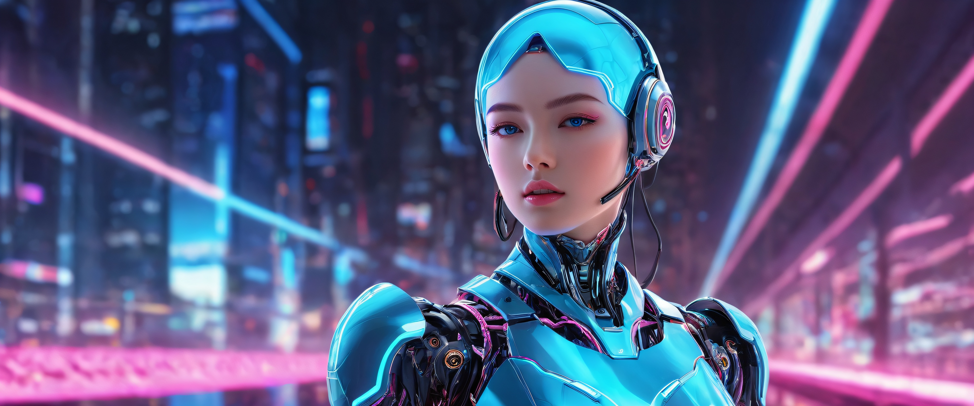 A breathtaking desktop wallpaper of Robot Girl, perfectly clean vast pure void, extreme depth of field, award-winning digital art, pristine clarity, ETHEREAL LIGHTING. Radiant, brilliant colors, ray traced reflections, and pristine clarity. Bright and airy.., [‘Metallic Silver’, ‘Electric Blue’, ‘Neon Pink’], 21:9 ultrawide panoramic aspect ratio, epic wide shot, ethereal lighting, radiant, brilliant colors, ray traced reflections, pristine clarity, award-winning digital art, epic breathtaking scale, stunning visual impact, perfect composition, highly textured surfaces, intricate micro-details, physically based rendering, macOS wallpaper aesthetic, masterpiece, highest quality, highly detailed, 8k resolution.