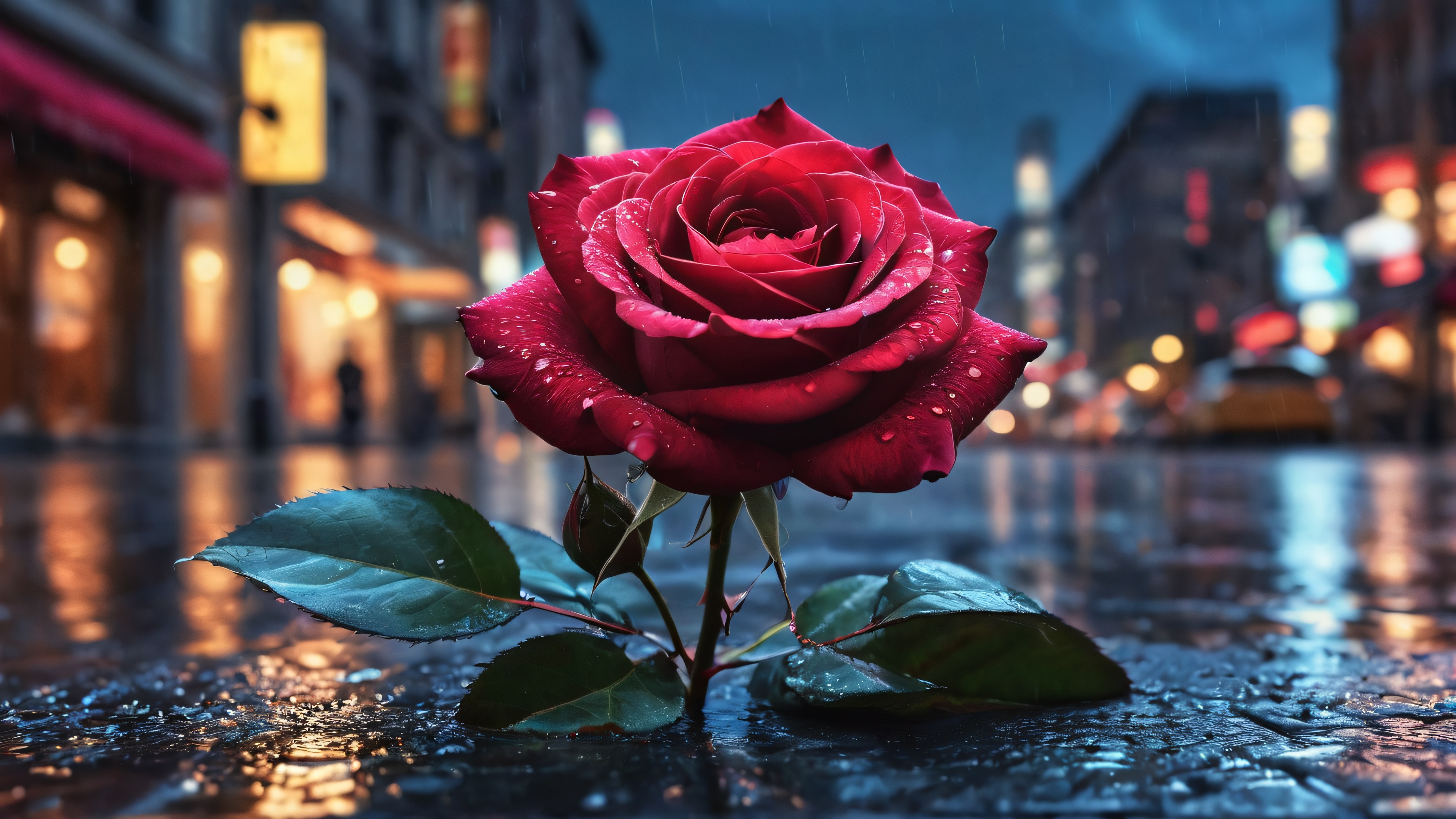 A breathtaking desktop wallpaper of Rose, Perfectly clean vast pure void, extreme depth of field, city street at dusk, Award-winning digital art, pristine clarity, moody lighting, cinematic feel, Ethereal lighting with radiant colors, ray traced reflections, and bright clarity, [‘Deep Crimson’, ‘Dark Gray’, ‘Rainy Night Blues’], 16:9 aspect ratio, ethereal lighting, radiant, brilliant colors, ray traced reflections, pristine clarity, award-winning digital art, epic breathtaking scale, stunning visual impact, perfect composition, highly textured surfaces, intricate micro-details, physically based rendering, macOS wallpaper aesthetic, masterpiece, highest quality, highly detailed, 8k resolution.