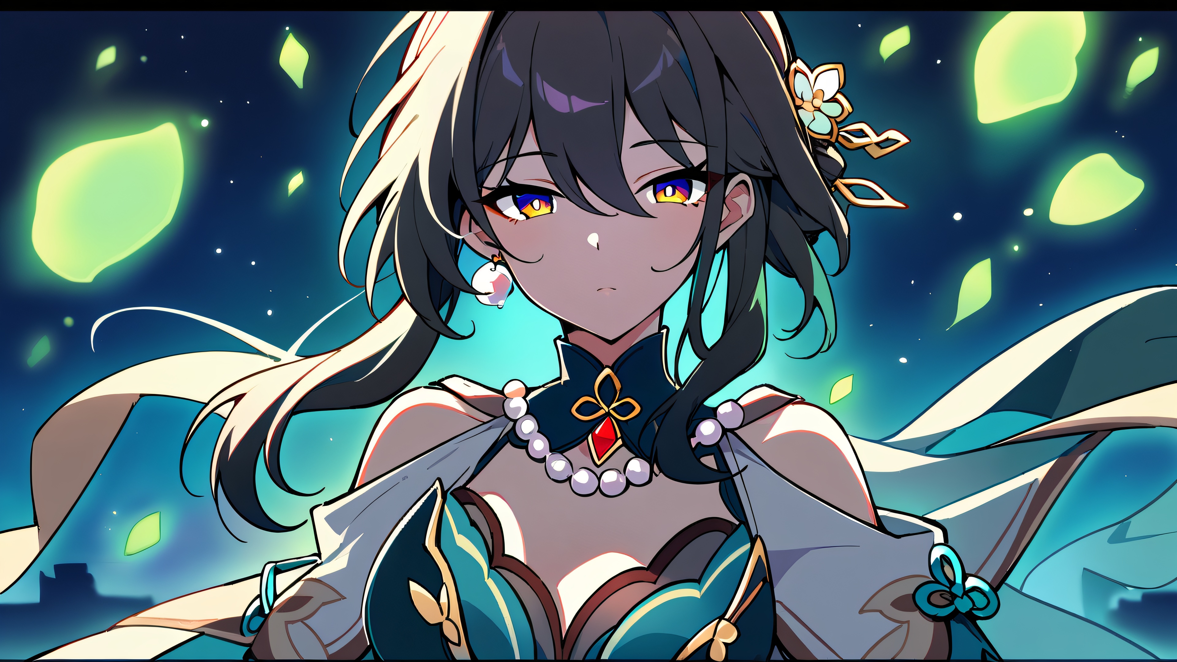 Elegant low-key lighting illuminates the scene as Ruan Mei’s captivating expression commands attention. Her gaze pierces through the darkness, drawing focus to her ethereal features. The surrounding environment, a masterpiece of absurdres and highly detailed design, showcases a perfectly clean and vast pure void with extreme depth of field. Pink, purple, and neon green hues harmonize in the night sky, creating a striking contrast that complements Ruan Mei’s solo presence.