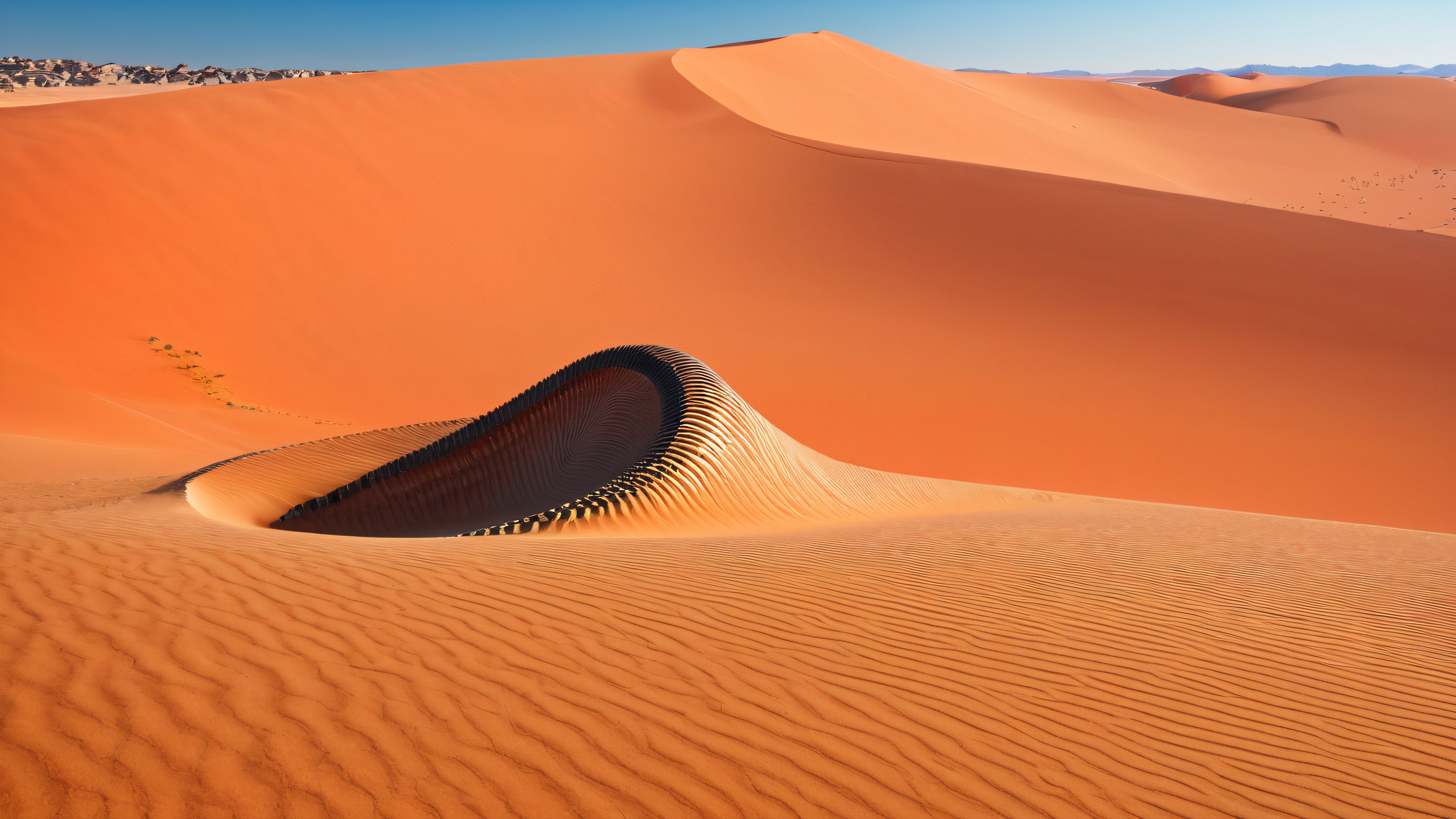 This stunning 4K wallpaper features a gargantuan sandworm rising from the rust-red desert landscape, its undulating body and writhing tendrils evoking a sense of primal power. The desolate yet majestic dune sea stretches out to the horizon, punctuated by rocky outcroppings and twisted vegetation. Harsh sunlight casts long shadows, highlighting the worm’s warm body and deep crevices in the terrain.