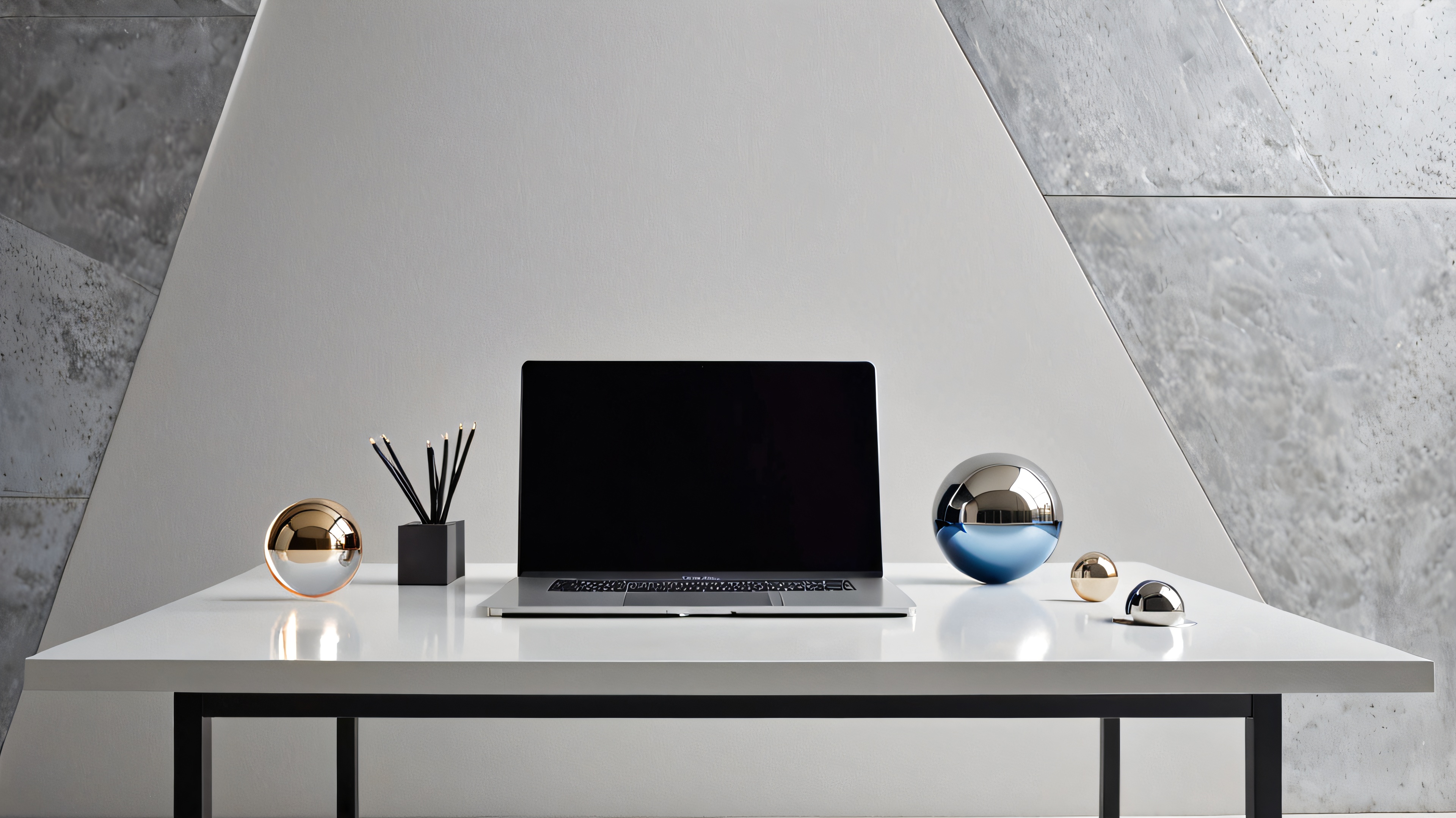 This stunning 4K wallpaper features a serene, minimalist workspace with a sleek laptop open on a clean, white desk. Geometric paperweights and a delicate glass orb add a touch of elegance, while the subtle gradient background provides a calming atmosphere. Exposed concrete walls, polished steel accents, and spotlights create a sense of industrial chic, while the focus on texture and reflectivity adds depth and nuance. The palette is characterized by soft grays, creamy whites, and warm beiges, with a hint of industrial blue and metallic sheen.