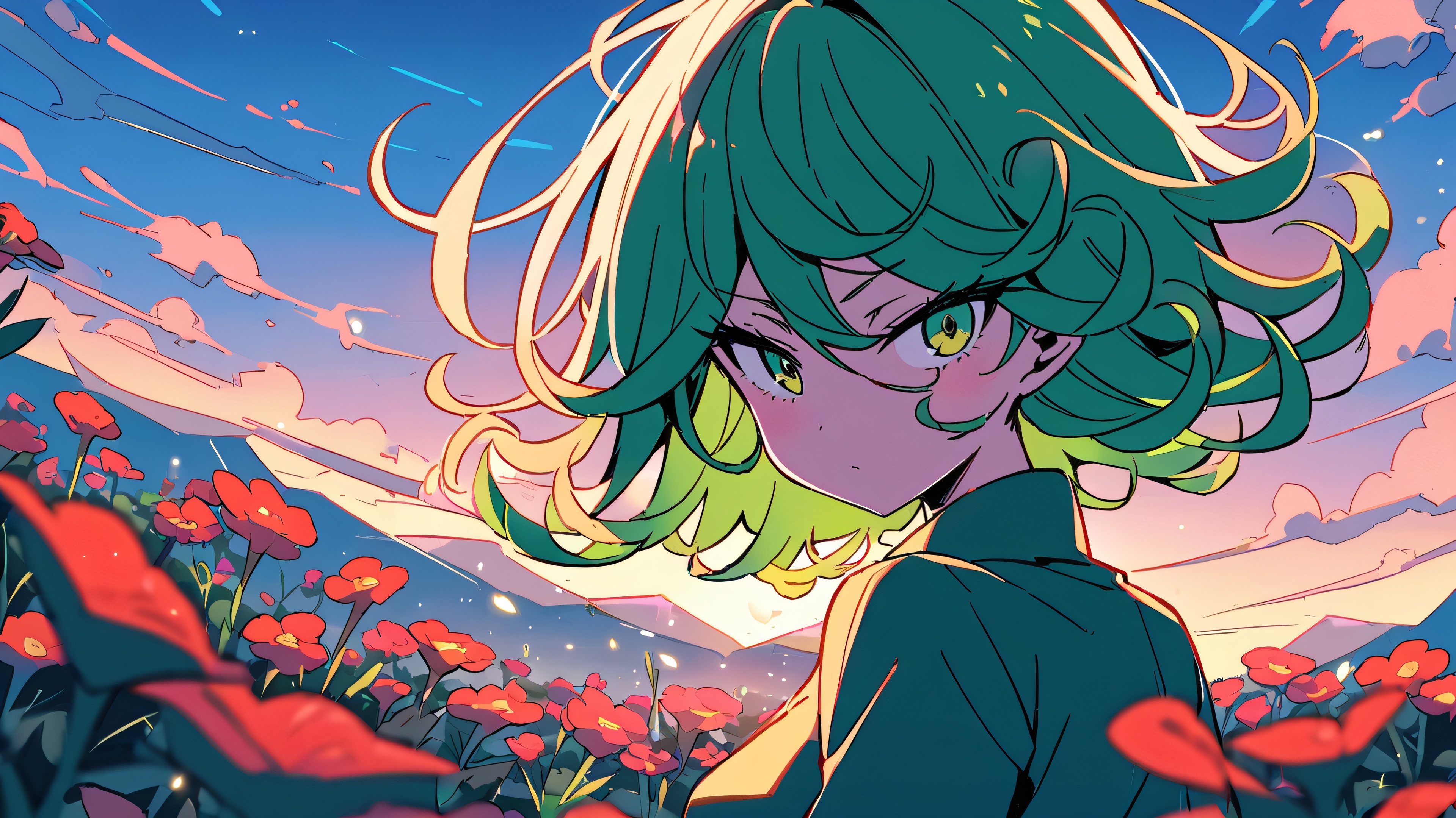 1girl, tatsumaki, one punch man, solo, masterpiece, best quality, very aesthetic, absurdres, highly detailed, looking at viewer, Perfectly clean vast pure void, extreme depth of field, serene summer atmosphere with red flowers and sunlight, [‘Red’, ‘Pink’], 16:9 aspect ratio, bright and airy, ethereal lighting, beautiful sky, cinematic lighting, vivid colors