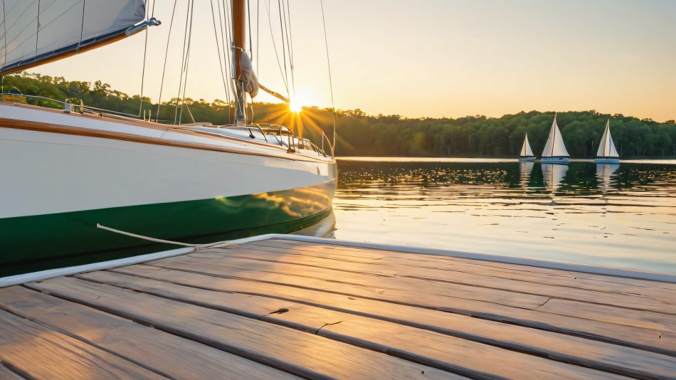 Warm golden hour lighting illuminates the intricately crafted wooden decks and crisp white sails of the sailboat, gently bobbing against the worn wooden planks of the dock. Lush greenery and tall trees line the shore, their leaves rustling softly in the breeze. The scene is set against a mirror-like calm water’s surface, with gentle ripples barely disturbing the peaceful atmosphere.