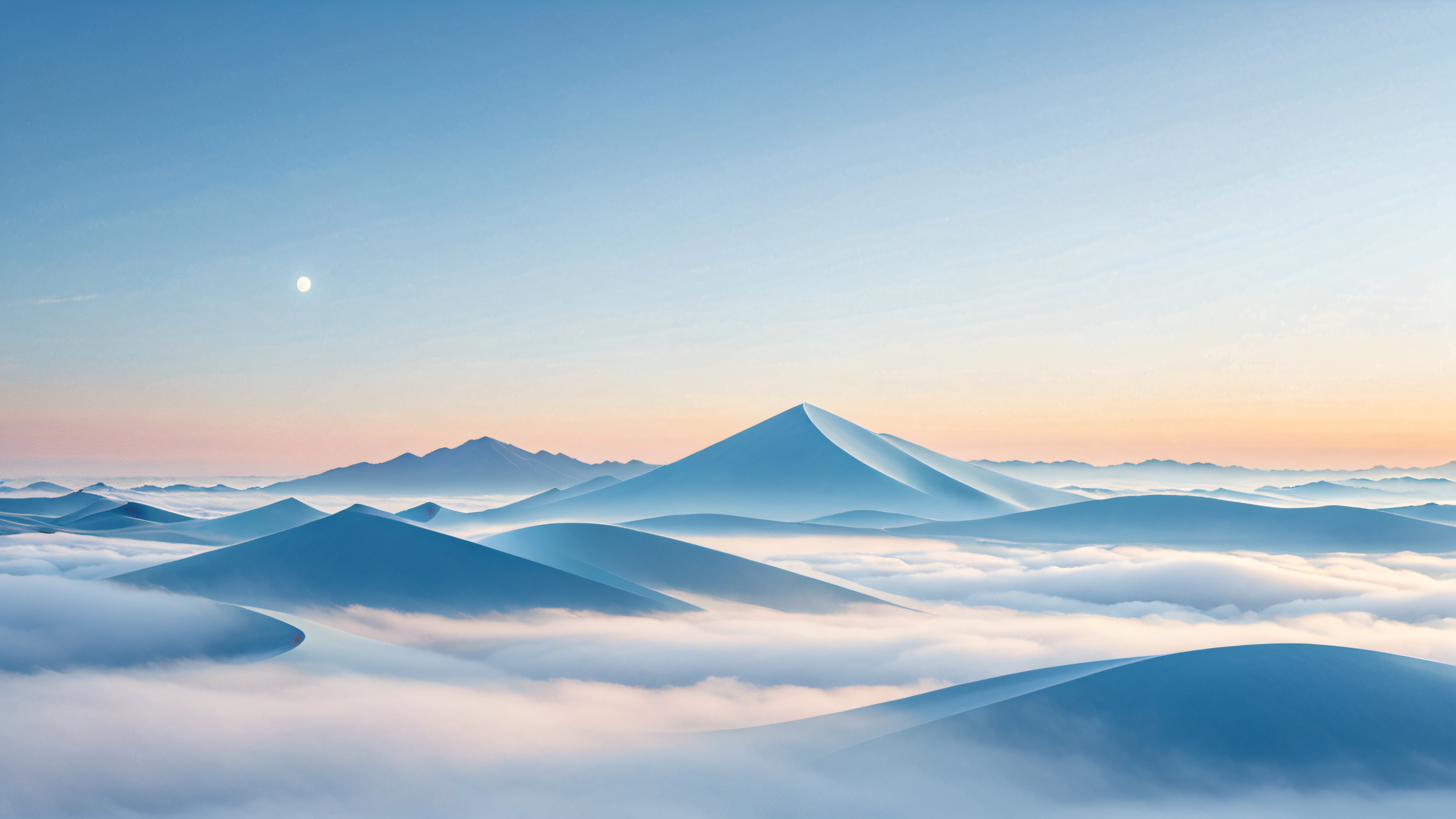 Delicate lines and curves dance across the scene, blending seamlessly with the soft blue-gray illumination. The dreamy atmosphere is reminiscent of a cloud-filled sky at dawn, inviting contemplation and reflection. Soft blue hues (#87CEEB to #ADD8E6) are punctuated by delicate white highlights and faint wisps of creamy mist.