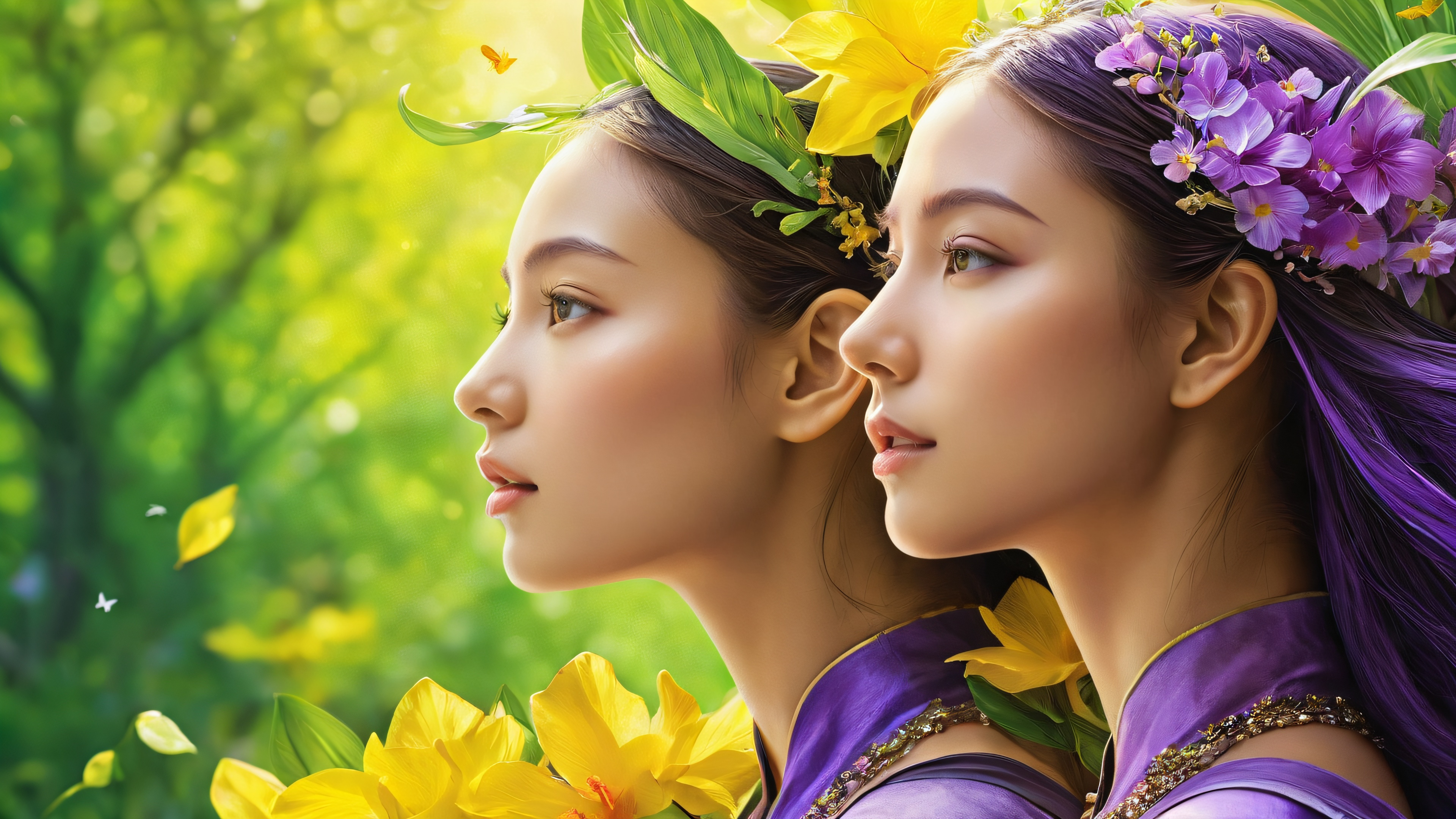 A breathtaking desktop wallpaper of Two Women, Perfectly clean vast pure void, extreme depth of field with a focus on the serene natural setting., Award-winning digital art, pristine clarity with intricate details and vibrant colors., Ethereal lighting with radiant, brilliant colors, ray-traced reflections, and pristine clarity, creating a bright and airy atmosphere., [‘Green’, ‘Yellow’, ‘Purple’], 16:9 aspect ratio, ethereal lighting, radiant, brilliant colors, ray traced reflections, pristine clarity, award-winning digital art, epic breathtaking scale, stunning visual impact, perfect composition, highly textured surfaces, intricate micro-details, physically based rendering, macOS wallpaper aesthetic, masterpiece, highest quality, highly detailed, 8k resolution.