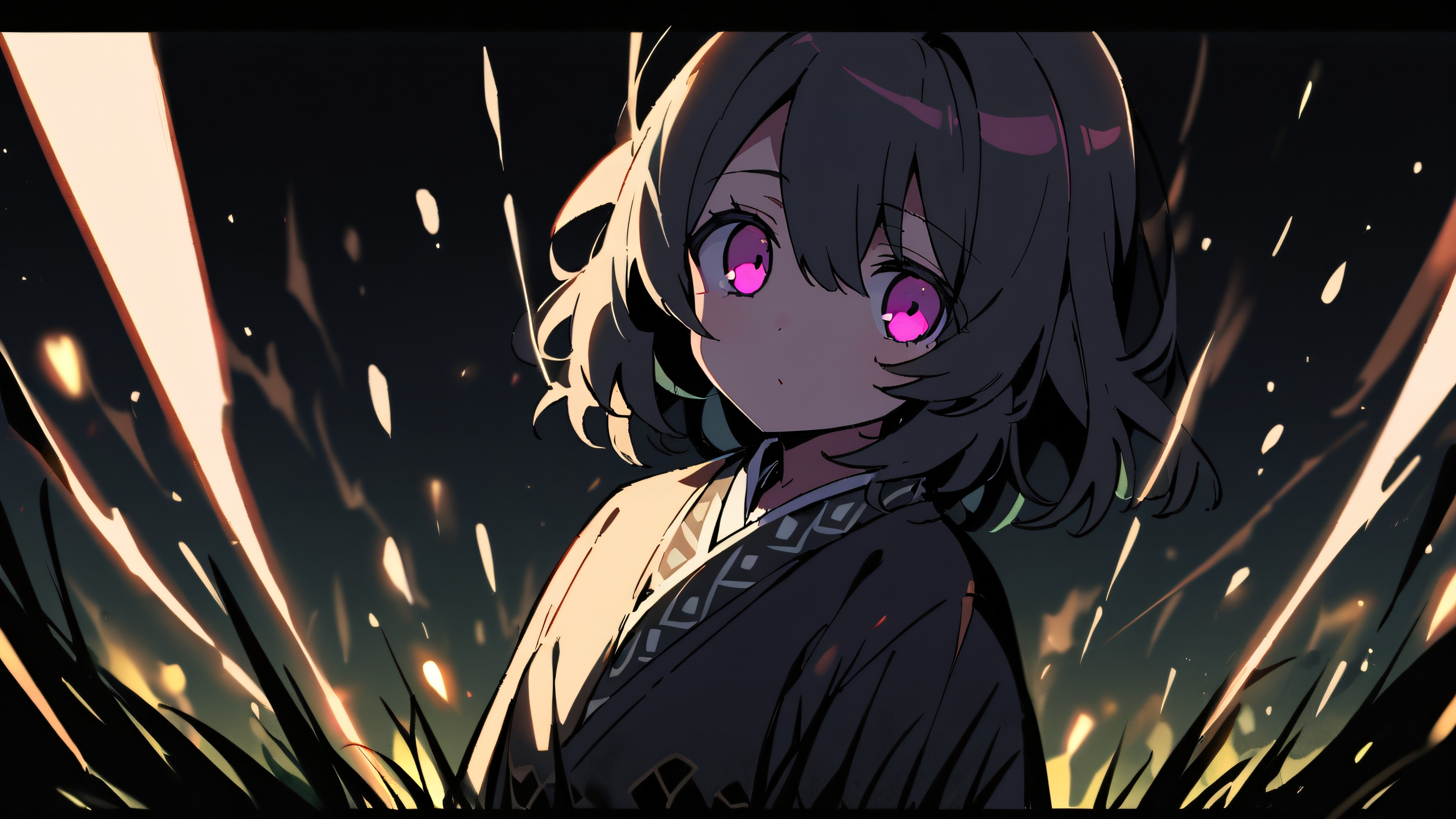 1girl, shinobu kocho, demon slayer, solo, masterpiece, best quality, very aesthetic, absurdres, highly detailed, looking at viewer, Perfectly clean vast pure void, extreme depth of field with a tree and grass in the distance, #FF69B4, 16:9 aspect ratio, elegant low-key lighting, striking contrast, deep perfect blacks, night scene, glowing lights, dramatic shadows