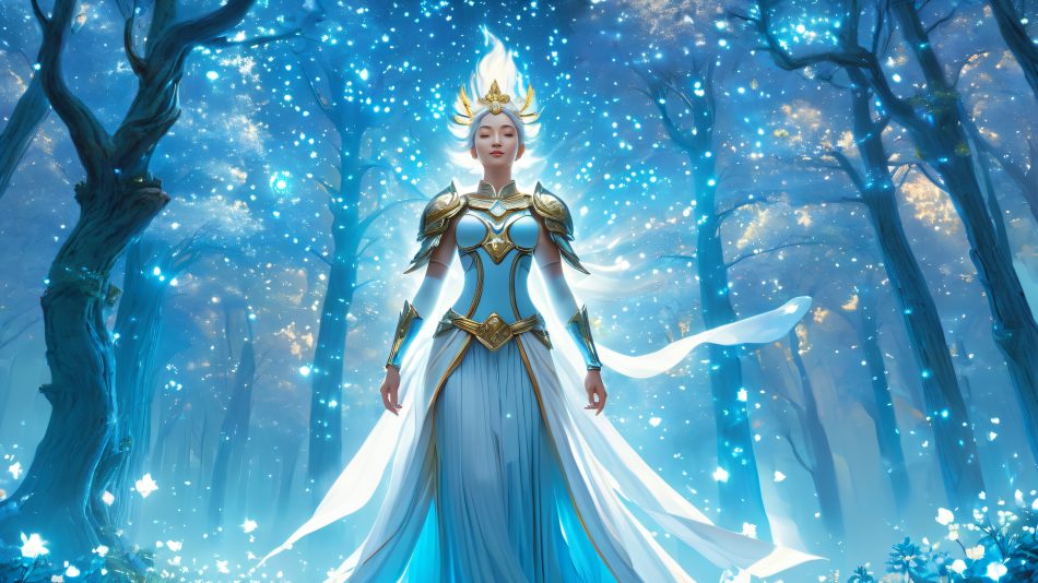 This breathtaking illustration depicts a radiant cleric surrounded by an aura of divine light, set amidst a mystical forest. The trees’ twisted trunks and leaves shimmer like tiny stars, illuminated by a soft, blue glow. The artwork features subtle, intricate textures and shading, reminiscent of fine art. The palette of soft blues, whites, and hints of gold and rose evokes a sense of serenity, hope, and wonder.