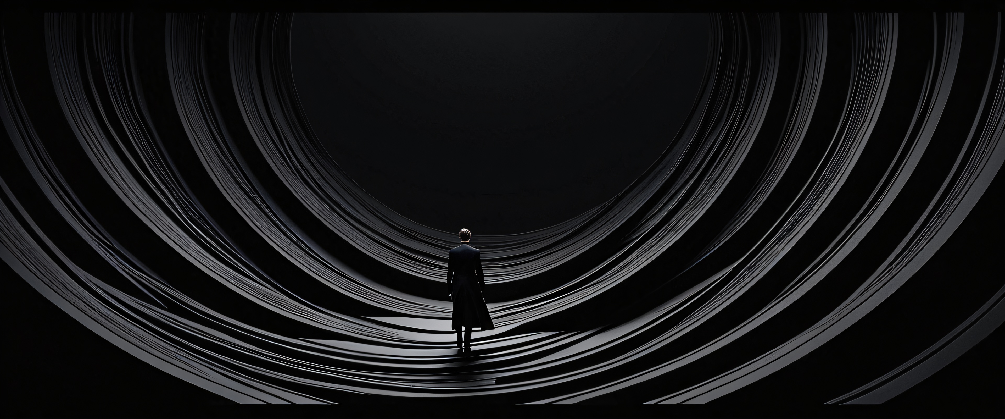 A breathtaking desktop wallpaper of Figures, Perfectly clean vast pure void, extreme depth of field, Award-winning digital art, pristine clarity; abstract, almost sculptural; reminiscent of abstract realism and expressionism, SLEEK DARK MODE AESTHETIC. Deep perfect blacks, striking crisp contrast, and elegant luminescent accents. AVOID cinematic lighting., [‘Dark Tones’], 21:9 ultrawide panoramic aspect ratio, epic wide shot, elegant low-key lighting, deep perfect blacks, striking contrast, sleek dark mode aesthetic, luminescent accents, deep rich colors, award-winning digital art, epic breathtaking scale, stunning visual impact, perfect composition, highly textured surfaces, intricate micro-details, physically based rendering, macOS wallpaper aesthetic, masterpiece, highest quality, highly detailed, 8k resolution.