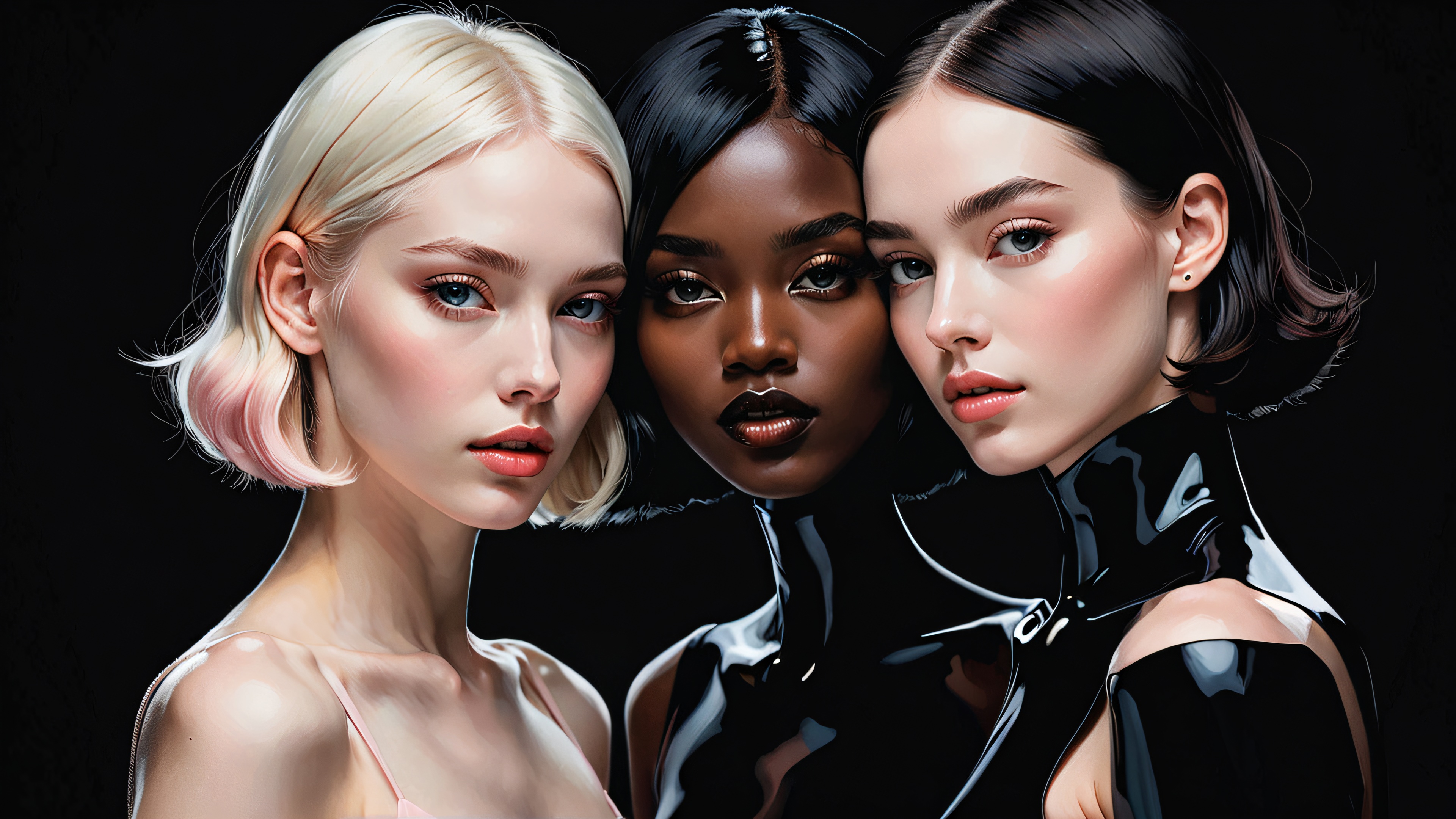 A breathtaking desktop wallpaper of Two Women, perfectly clean vast pure void, extreme depth of field, award-winning digital art, pristine clarity, SLEEK DARK MODE AESTHETIC. Deep perfect blacks, striking crisp contrast, and elegant luminescent accents., [‘Soft Pastel Pink’, ‘Cream’, ‘White’], 16:9 aspect ratio, elegant low-key lighting, deep perfect blacks, striking contrast, sleek dark mode aesthetic, luminescent accents, deep rich colors, award-winning digital art, epic breathtaking scale, stunning visual impact, perfect composition, highly textured surfaces, intricate micro-details, physically based rendering, macOS wallpaper aesthetic, masterpiece, highest quality, highly detailed, 8k resolution.