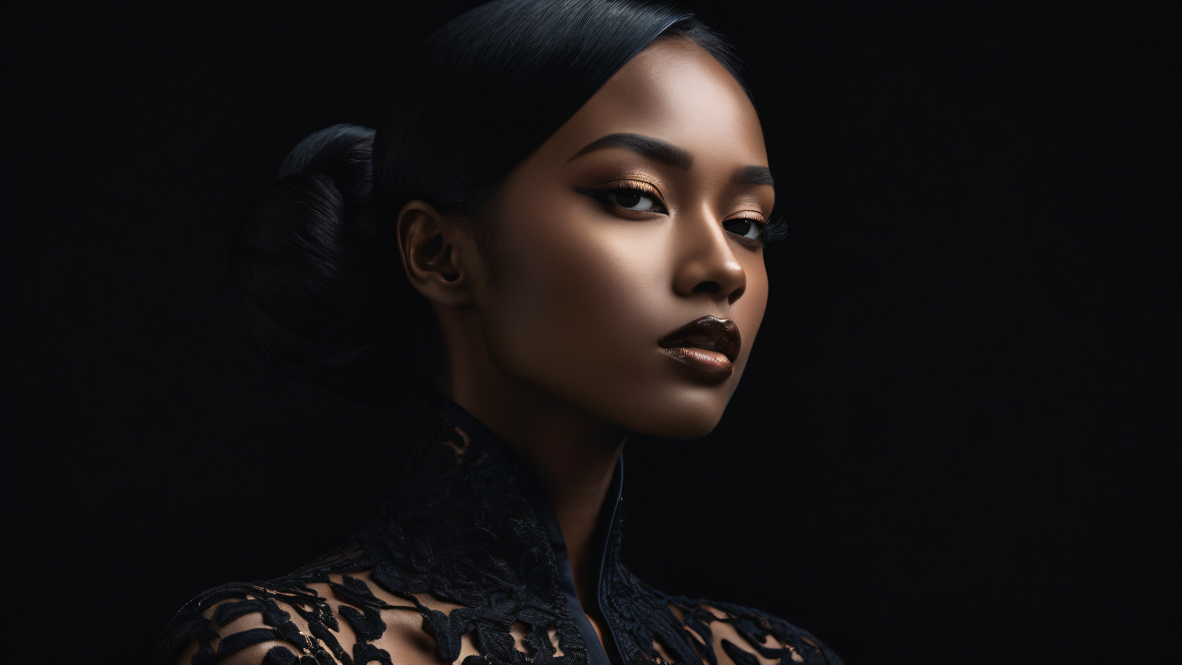 A breathtakingly beautiful and highly detailed 8k resolution wallpaper featuring an elegant woman surrounded by a pristine, dark void. The scene is characterized by deep perfect blacks, striking contrast, and luminescent accents that add a touch of sophistication and elegance to the overall aesthetic. The image showcases impeccable texture, intricate micro-details, and physically-based rendering, making it a masterpiece in the realm of digital art.