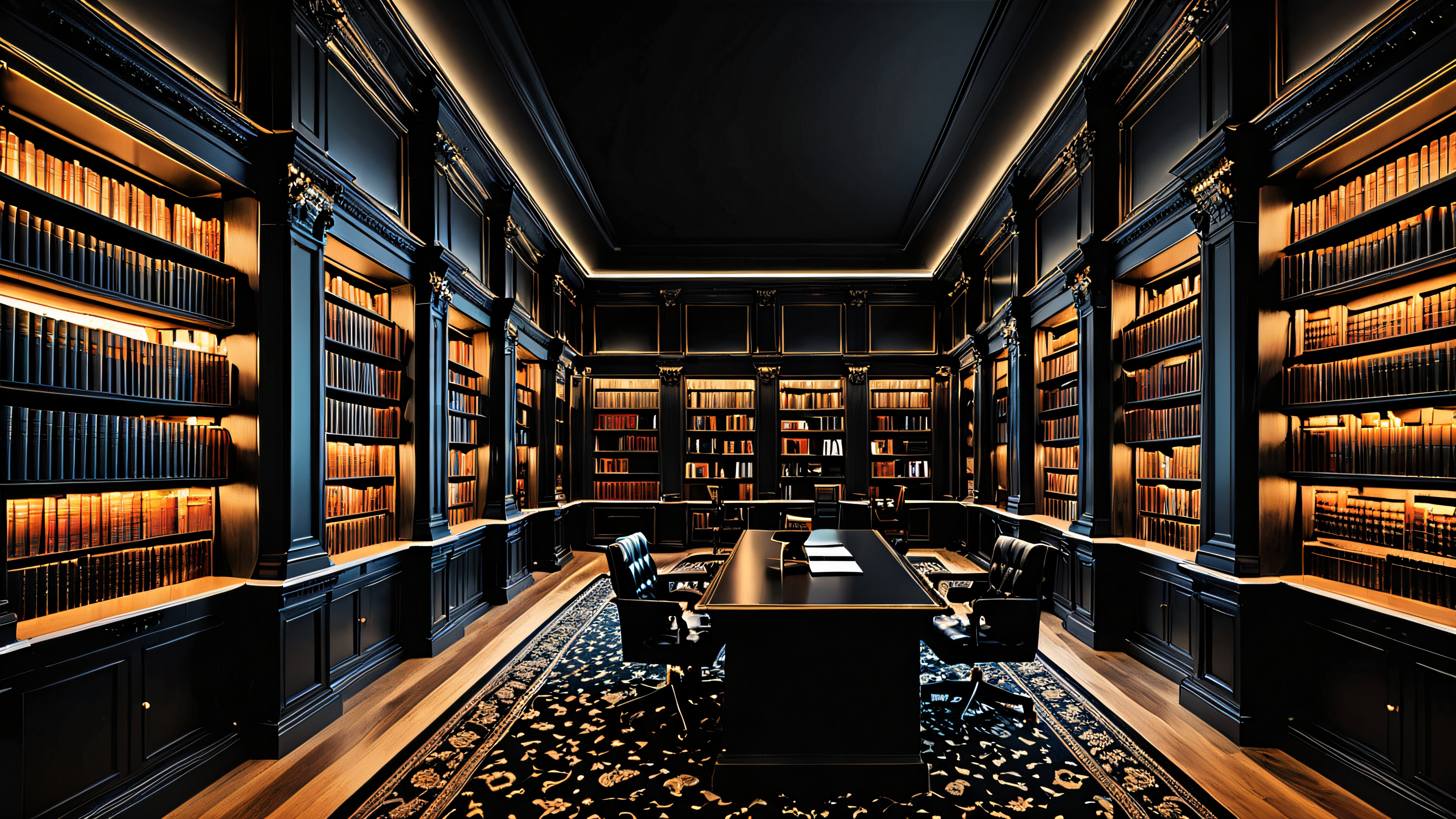 This stunning desktop wallpaper transports you to an award-winning digital art masterpiece. The library’s sleek dark mode aesthetic is characterized by deep perfect blacks, striking contrast, and elegant luminescent accents. The 16:9 aspect ratio and low-key lighting create a sense of depth, while the highly textured surfaces and intricate micro-details showcase physically based rendering at its finest.