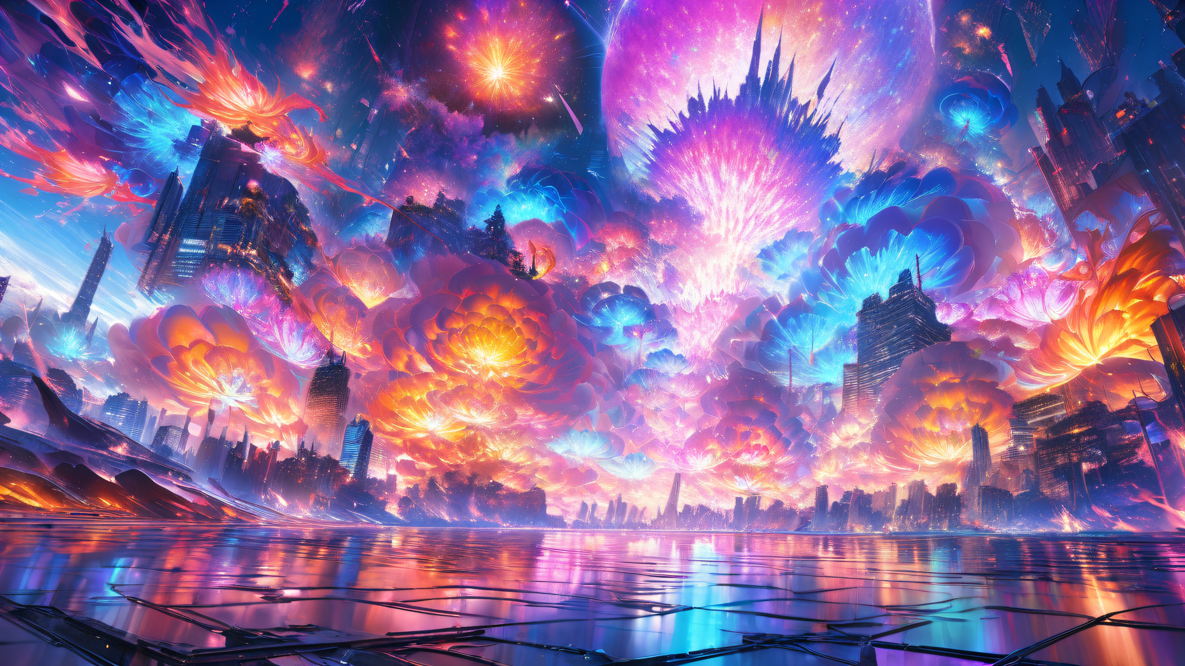 The image features a mesmerizing 4K desktop wallpaper with a swirling 3D smoke vortex at its center. The air is thick with wispy tendrils of orange, pink, and purple hues, evoking a psychedelic flower blooming mid-air. In the background, a darkened cityscape with towering skyscrapers and neon lights reflects off the wet pavement, creating a sense of chaos and urgency.