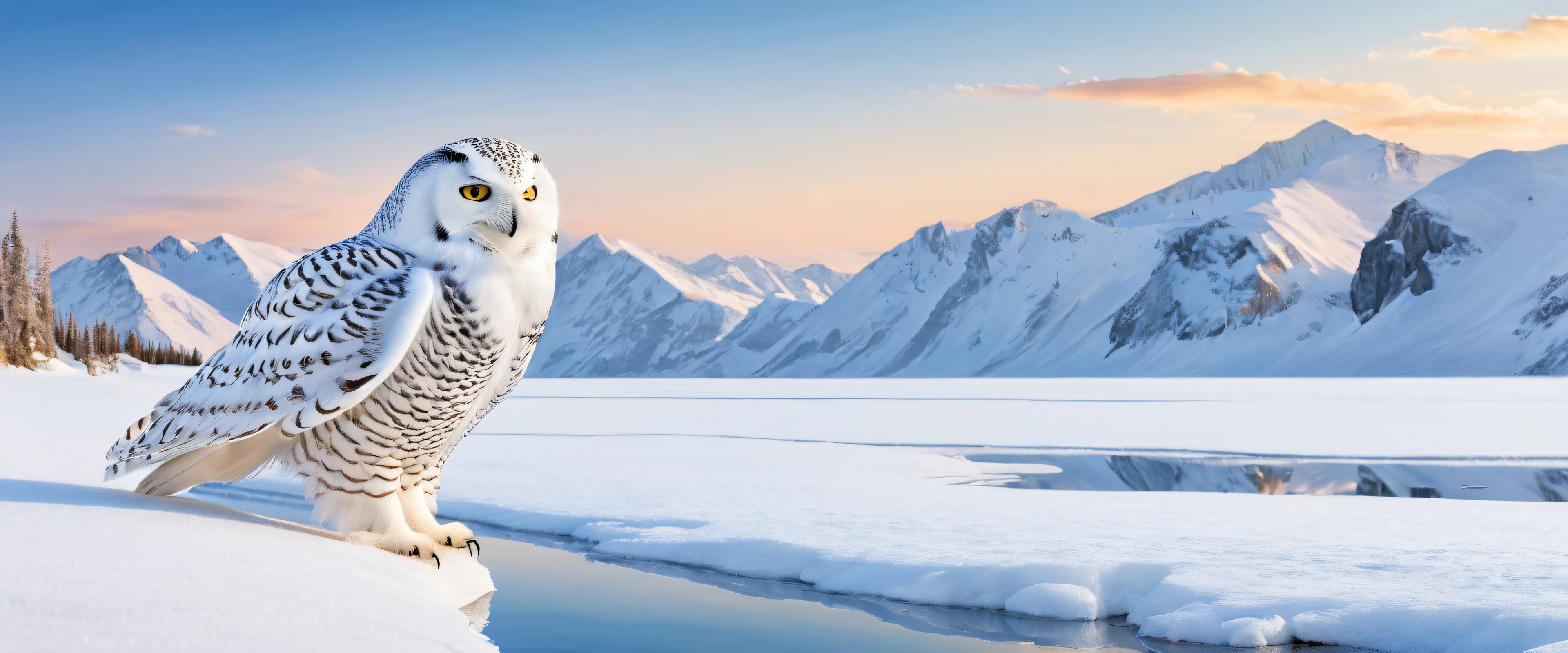 A breathtaking desktop wallpaper of Snowy Owl Tracking Lemmings, Perfectly clean vast pure void, extreme depth of field with subtle crack patterns and frozen lake reflection, Award-winning digital art, pristine clarity with watercolor inspiration, Ethereal lighting with radiant brilliant colors, ray traced reflections, and pristine clarity, bright and airy with a hint of mistiness, Soft blues and whites with touches of brown and cream, evoking a sense of serenity and calm, 21:9 ultrawide panoramic aspect ratio, epic wide shot, ethereal lighting, radiant, brilliant colors, ray traced reflections, pristine clarity, award-winning digital art, epic breathtaking scale, stunning visual impact, perfect composition, highly textured surfaces, intricate micro-details, physically based rendering, macOS wallpaper aesthetic, masterpiece, highest quality, highly detailed, 8k resolution.