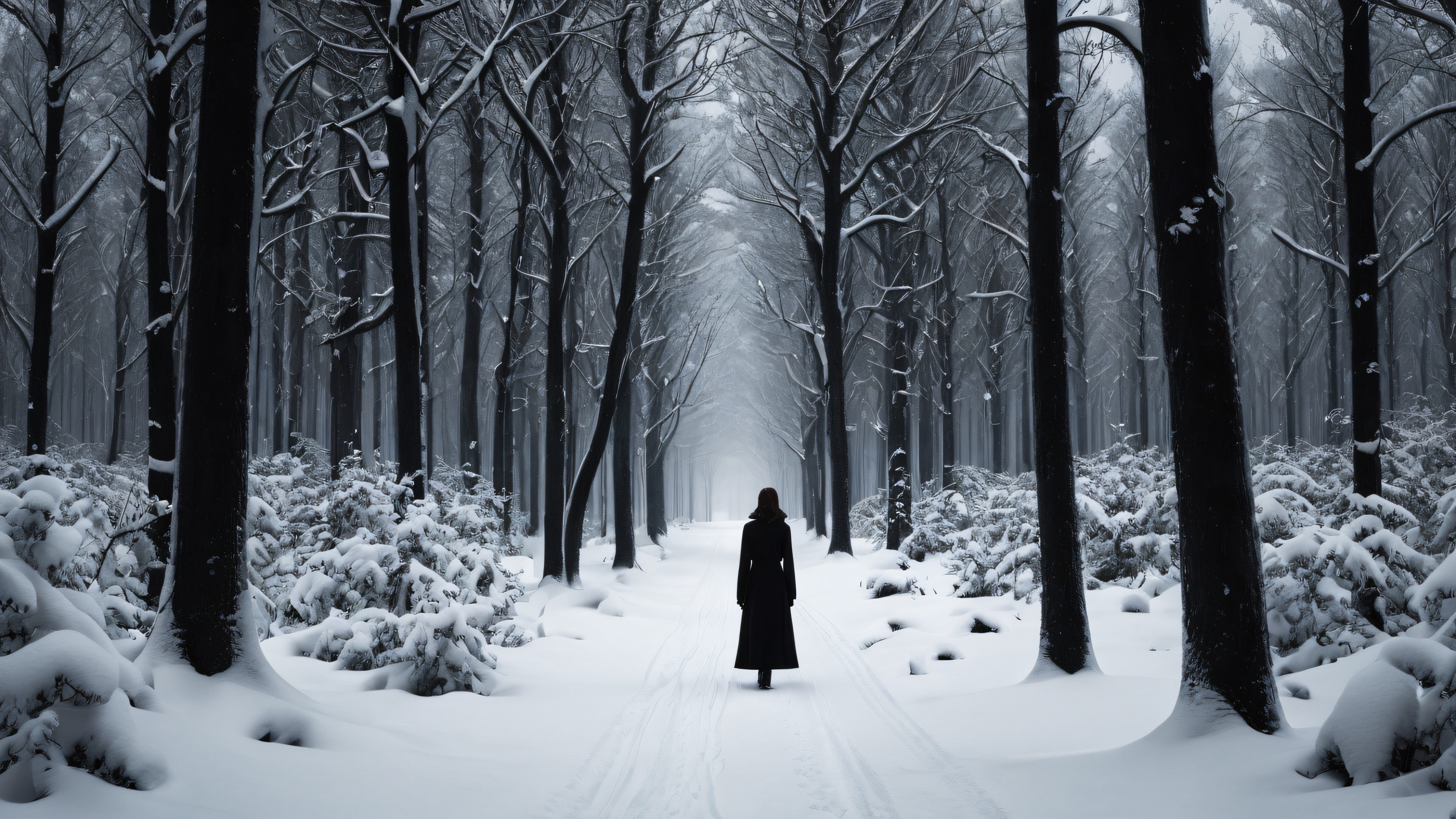 A breathtaking desktop wallpaper of Solitary Woman, Desolate winter forest with perfectly clean vast pure void and extreme depth of field, Award-winning digital art, pristine clarity with film grain texture, SLEEK DARK MODE AESTHETIC: Deep perfect blacks, striking crisp contrast, and elegant luminescent accents, [‘Black’, ‘White’], 16:9 aspect ratio, elegant low-key lighting, deep perfect blacks, striking contrast, sleek dark mode aesthetic, luminescent accents, deep rich colors, award-winning digital art, epic breathtaking scale, stunning visual impact, perfect composition, highly textured surfaces, intricate micro-details, physically based rendering, macOS wallpaper aesthetic, masterpiece, highest quality, highly detailed, 8k resolution.