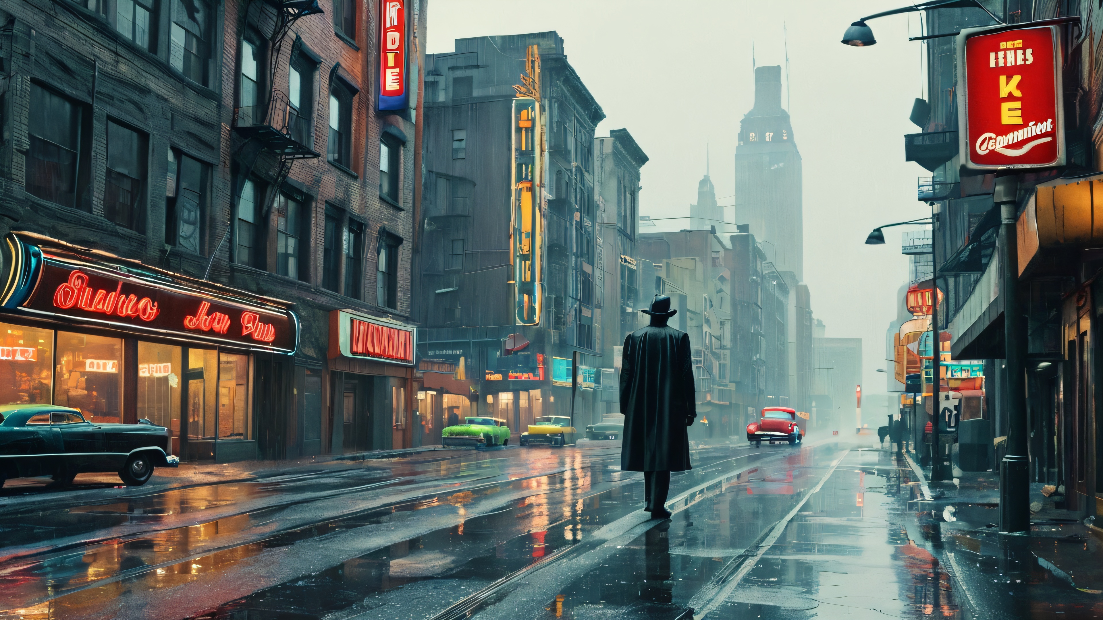 This stunning 4K desktop wallpaper features a gritty, 1950s-style cityscape with a mix of industrial and Art Deco architecture, complete with crumbling facades, abandoned buildings, and a sense of decay. The scene is bathed in low-key lighting, with deep shadows and a focus on neon signage and city lights reflecting off wet pavement. The color palette is predominantly dark and moody, with shades of black, gray, and dark blue punctuated by splashes of neon green, red, and yellow.