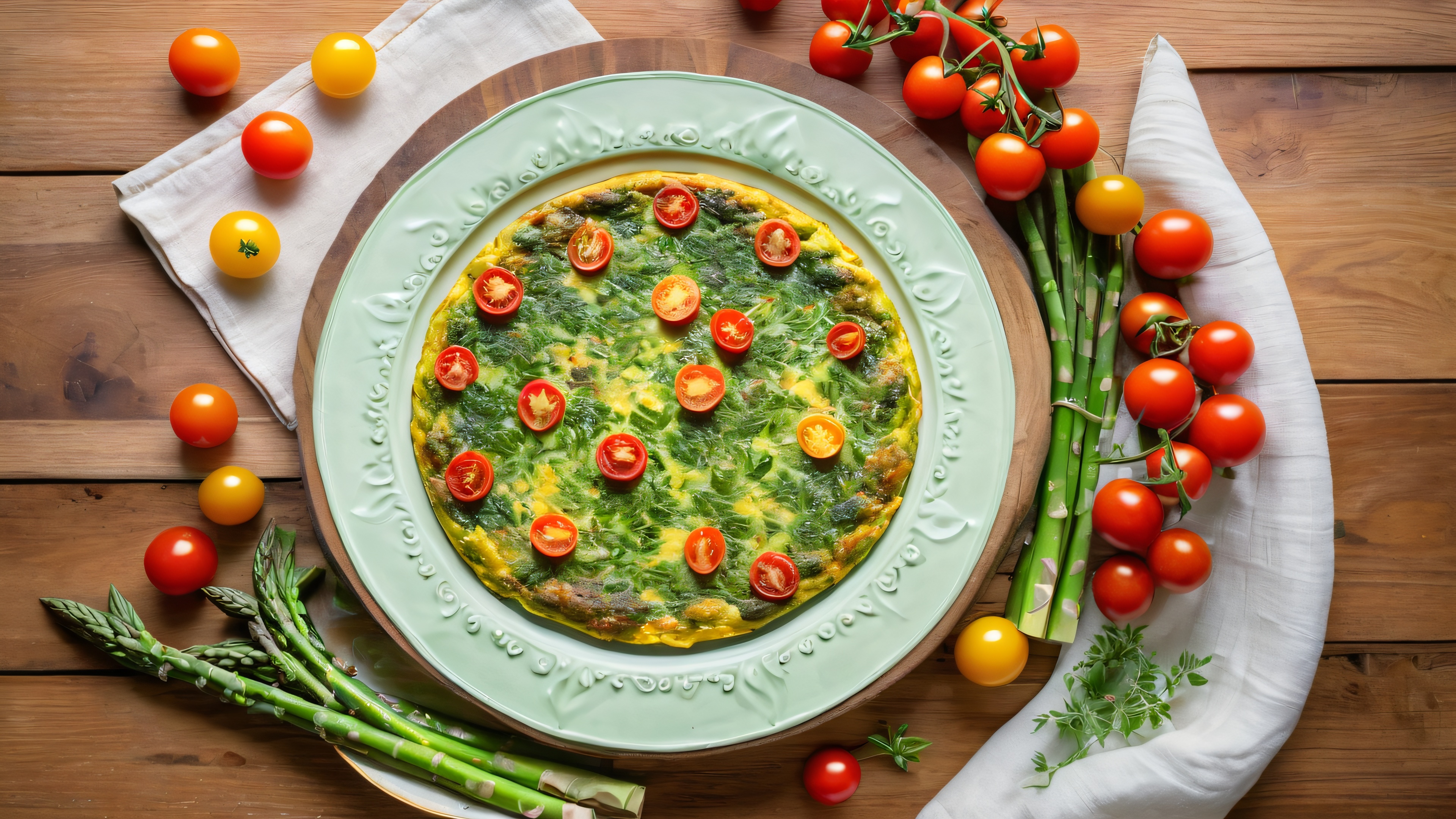 This breathtaking 4K wallpaper features a vibrant spring green frittata with a delicate golden-brown crust, nestled among crisp asparagus and juicy cherry tomatoes. The rustic kitchen table, with its distressed wooden surface and vintage ceramic plate, adds warmth and texture to the scene. The soft, warm lighting and gentle golden hour glow create a comforting ambiance, inviting the viewer to step into the serene and peaceful atmosphere.