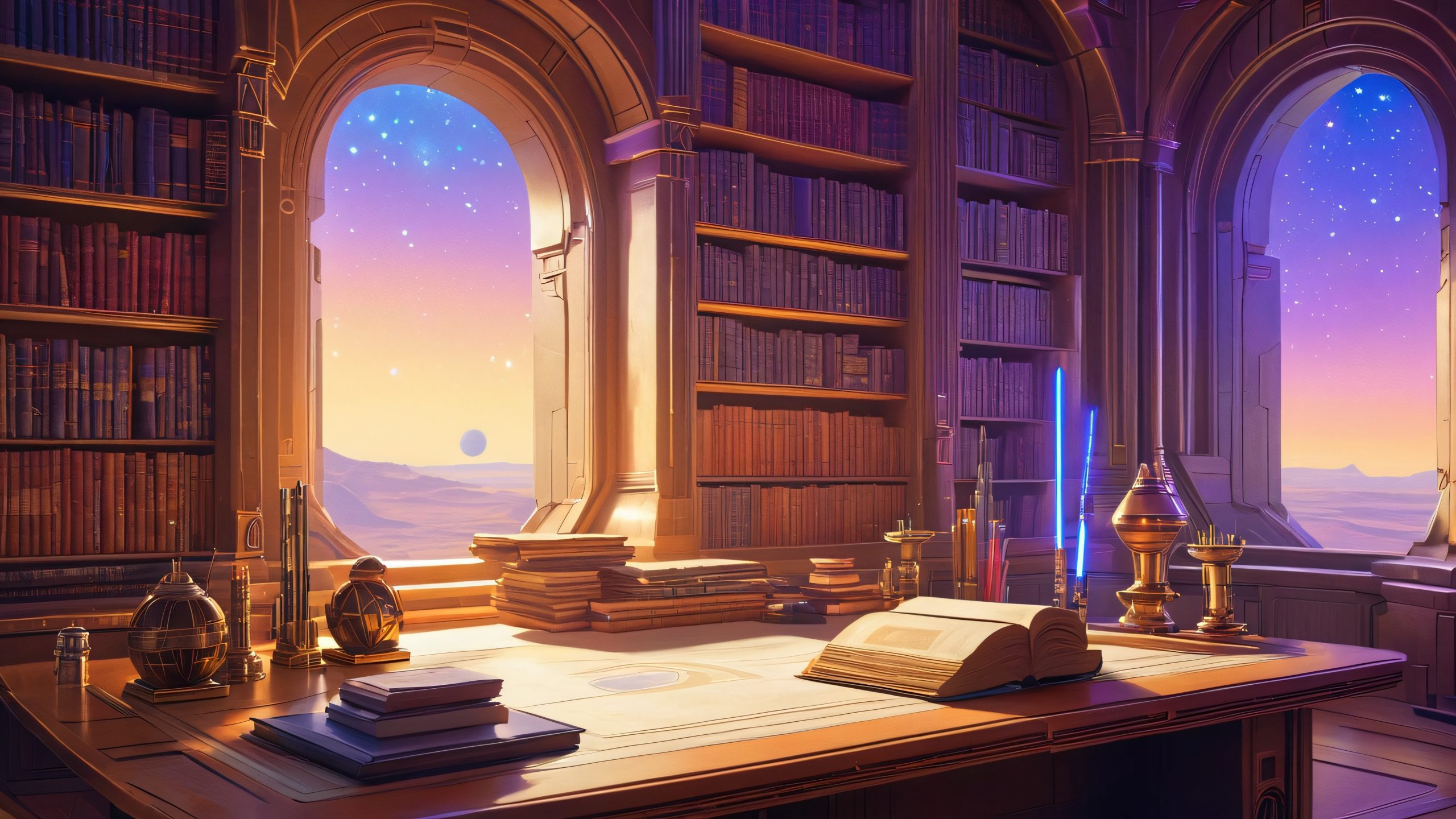 This stunning 4K wallpaper depicts a young Padawan’s creative journey, filled with intricate illustrations of beloved Star Wars characters. The wise and powerful Jedi Master takes center stage, surrounded by the tools of their trade: pencils, sketch paper, and a faintly glowing lightsaber hilt. The desk is adorned with a holographic display, casting a subtle blue glow. The room’s cozy atmosphere is enhanced by the towering bookshelves, filled with ancient tomes and mysterious artifacts, and the soft, diffused light filtering in through the windows. The illustration’s texture and shading evoke classic Star Wars concept art, with a rich palette of earthy tones, deep blues, and purples, and subtle accents of gold and crimson.