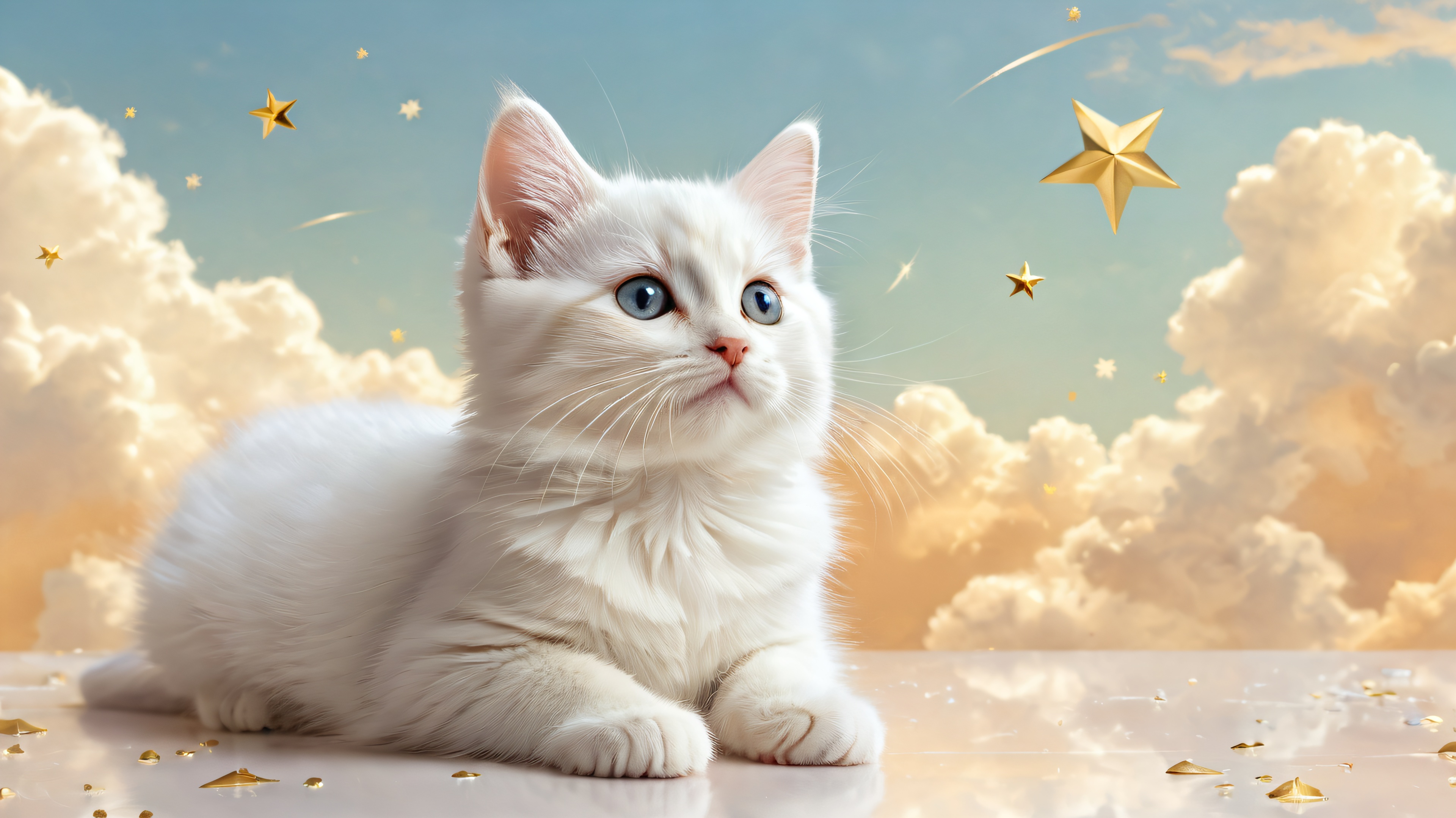 A breathtaking desktop wallpaper of Kitten, Perfectly clean vast pure void, extreme depth of field, with soft fluffy clouds and gold dusted shooting stars leaving trails of light, Award-winning digital art, pristine clarity, and photorealistic rendering, Ethereal lighting with radiant, brilliant colors, ray-traced reflections, and pristine clarity. Bright and airy., Vibrant pastel colors with shades of white, cream, and pale gold, 16:9 aspect ratio, ethereal lighting, radiant, brilliant colors, ray traced reflections, pristine clarity, award-winning digital art, epic breathtaking scale, stunning visual impact, perfect composition, highly textured surfaces, intricate micro-details, physically based rendering, macOS wallpaper aesthetic, masterpiece, highest quality, highly detailed, 8k resolution.
