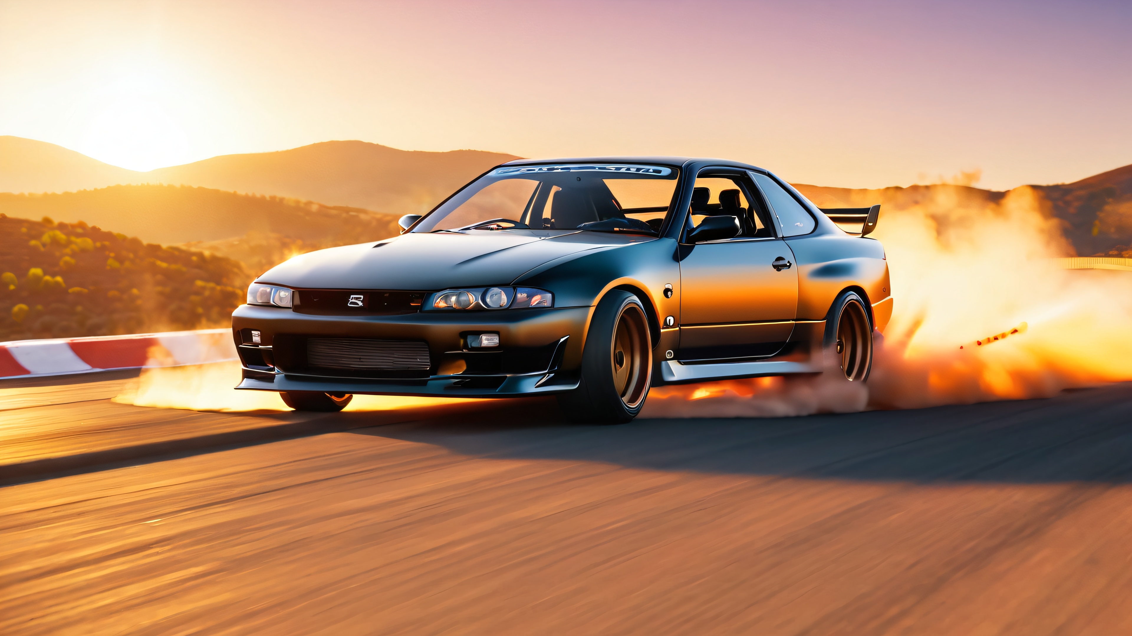 A 4K masterpiece of a Nissan S14 Silvia in motion, drifting around a serpentine track as the sun sets behind rolling hills. The matte black finish glistens with subtle texture mapping, while cinematic golden hour lighting casts long shadows emphasizing the curves of the car and terrain. A palette of deep blues and purples is punctuated by bursts of bright chrome and matte black, with hints of burnt orange from the setting sun.