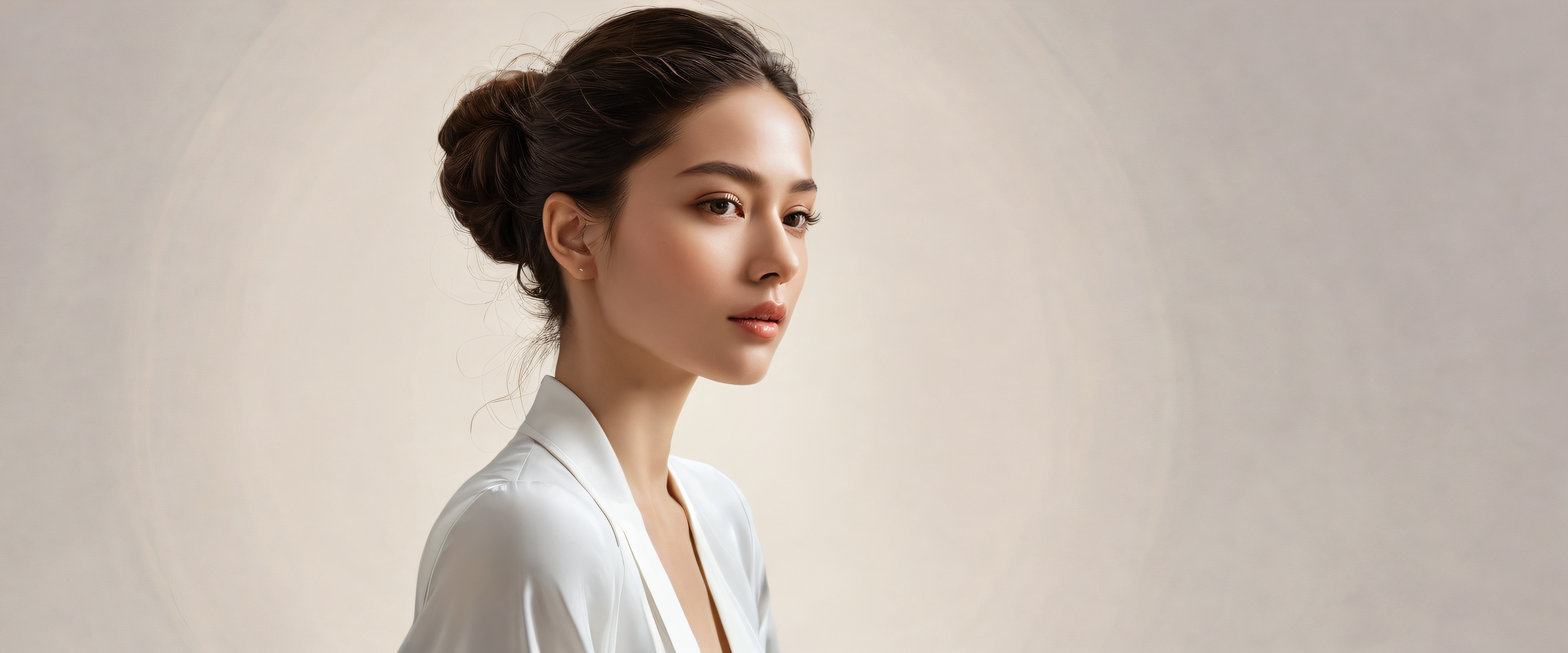 A breathtaking desktop wallpaper of Portait of a Woman, Perfectly clean vast pure void, extreme depth of field, with subtle hints of smokiness, Award-winning digital art, pristine clarity, hyper-realism with intricate details and textures, Ethereal lighting, radiant brilliant colors, ray-traced reflections, soft rim lighting with deep shadows, creating a sense of surreal elegance and cinematic framing, {‘dominant_palette’: [‘Deep Blacks’, ‘Golden Hues’, ‘Cool Whites’], ‘mood’: ‘Surreal Elegance’}, 21:9 ultrawide panoramic aspect ratio, epic wide shot, ethereal lighting, radiant, brilliant colors, ray traced reflections, pristine clarity, award-winning digital art, epic breathtaking scale, stunning visual impact, perfect composition, highly textured surfaces, intricate micro-details, physically based rendering, macOS wallpaper aesthetic, masterpiece, highest quality, highly detailed, 8k resolution.
