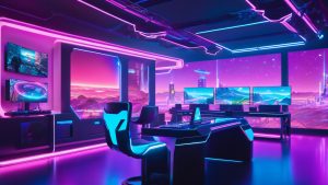 Neon Gaming Command Center 4K UHD Wallpaper Free Download: A hyper-realistic 3D render featuring a […]
