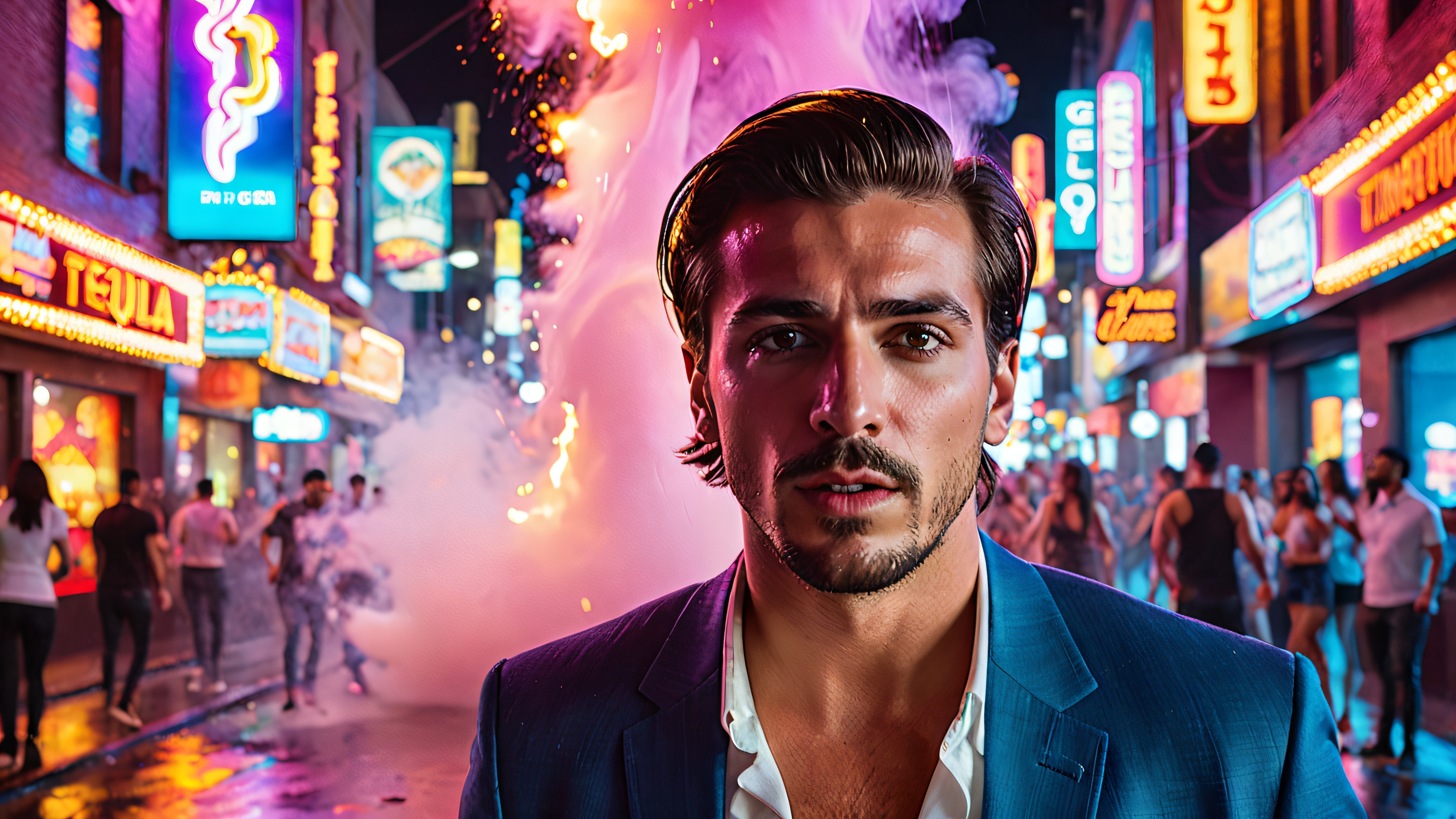 This 4K desktop wallpaper captures the intensity of a split-second moment when a careless mistake is made. The tequila-stained eyes well up with shock and surprise as the liquid pours down the face, accompanied by a blurred cityscape or nightclub in the background. The neon lights and haze of cigarette smoke add to the moody and intense atmosphere, with warm and cool lighting creating a gritty and cinematic feel.