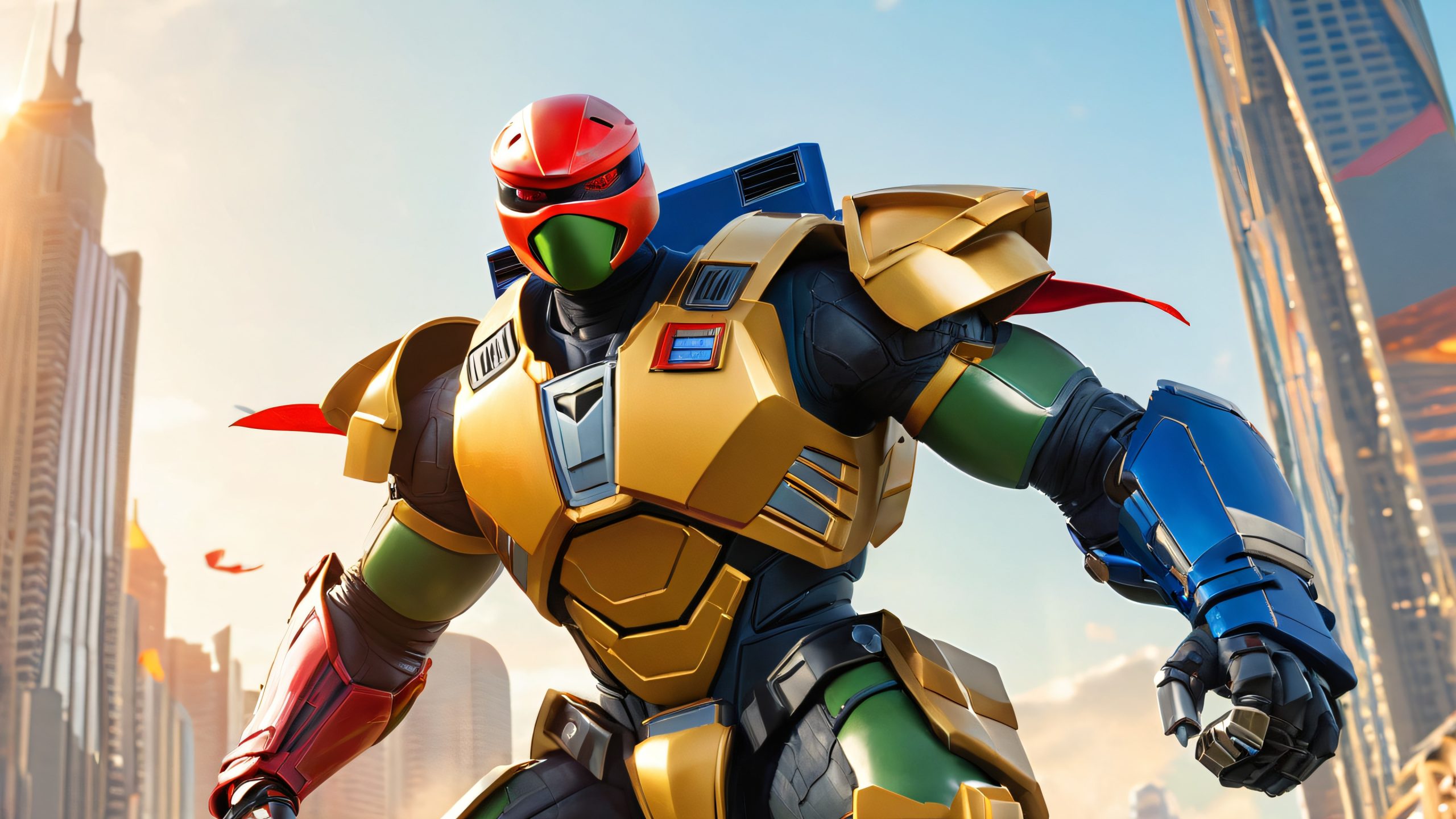 This 4K desktop wallpaper features a hyper-realistic comic book illustration of Leonardo, the heroic red-masked Teenage Mutant Ninja Turtle, and Jason Lee Scott, the courageous Red Ranger, standing back-to-back. The scene is set at sunset, with a cityscape of towering skyscrapers, bustling streets, and a hint of destruction and chaos in the air. The characters are rendered in bold, vibrant colors, with metallic blues and silvers, fiery oranges and yellows, and deep reds, set against a backdrop of dark blues and grays. The result is a masterpiece of highly detailed, high-quality illustration.