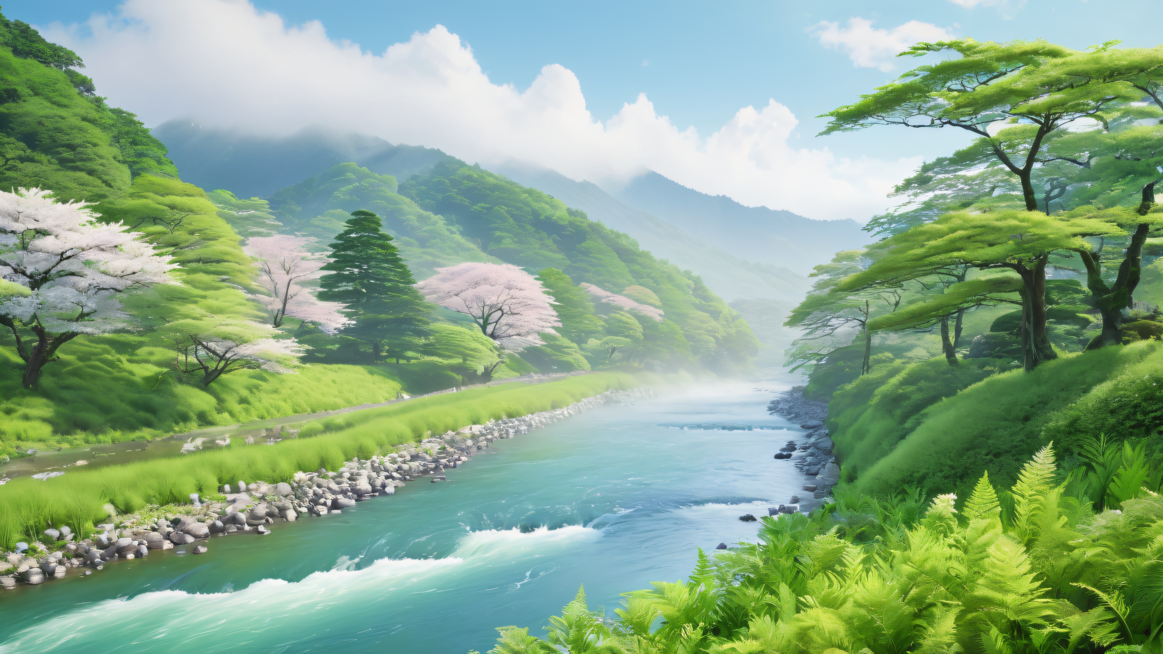 This stunning 4K wallpaper captures the majestic Tonegawa River flowing gently through the lush green hills of Minakami, Japan. The subtle mist veils the surrounding landscape, creating an otherworldly atmosphere. The river’s calm waters reflect the majestic mountains, while delicate cherry blossoms and ferns sway softly in the breeze. The warm morning light casts a serene glow over the entire scene, with pastel greens, blues, and neutral tones.
