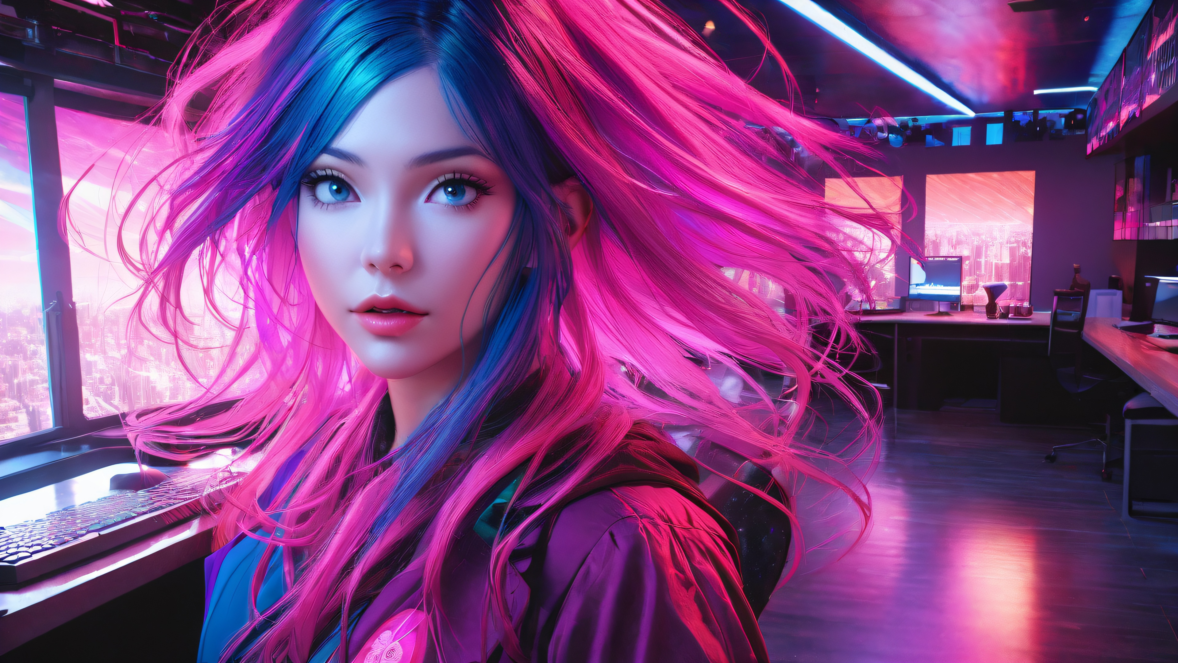 This stunning 4K wallpaper depicts a young woman with a thoughtful expression, her bright pink hair a testament to her vibrant personality, while her dark blue suit represents her analytical mind. The dimly lit office space, complete with a cityscape outside the window, symbolizes the constraints of reality and the struggle to find one’s true identity. The image features a mix of warm and cool tones, with a strong emphasis on atmospheric lighting to convey the emotional turmoil and introspection.