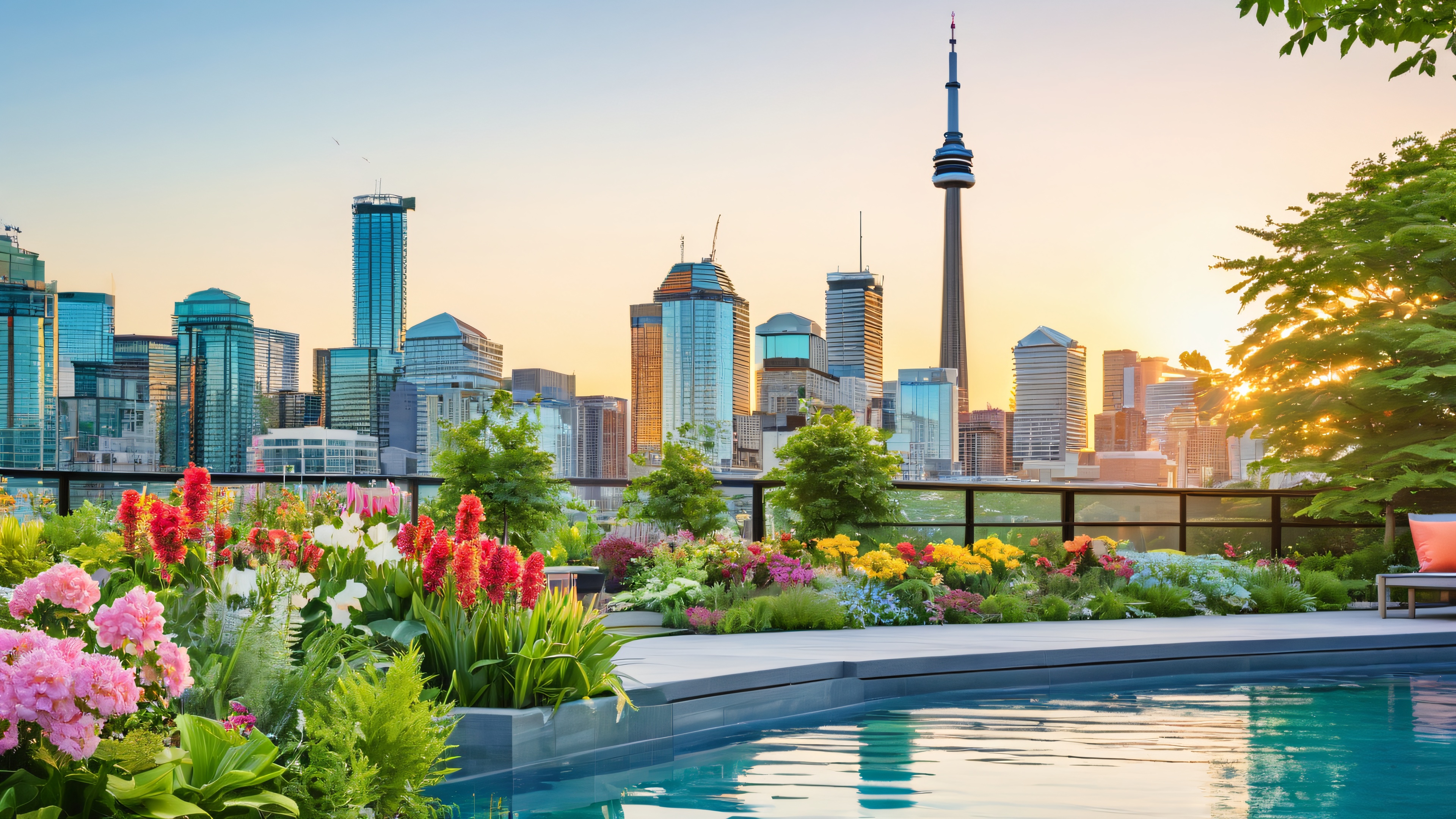 This stunning 4K desktop wallpaper depicts a tranquil rooftop oasis in the heart of Toronto. The scene is bathed in warm morning light, with a gentle golden hour glow that casts a soft, inviting ambiance. The lush greenery-filled garden is teeming with vibrant flowers, a tranquil water feature, and a sleek, modern outdoor seating area that offers a breathtaking city view. The CN Tower and other iconic buildings stand tall in the distance, surrounded by a picturesque neighborhood with a mix of modern and historic architecture. The color palette is calming, featuring a range of soothing greens, blues, and neutral tones, punctuated by pops of bright colors from the flowers and modern architectural features.