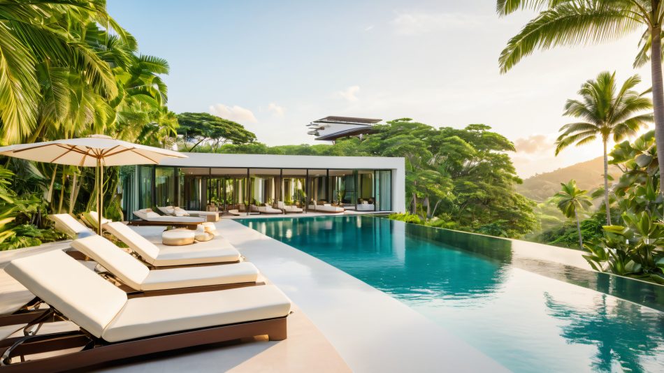 A serene and luxurious desktop background featuring a majestic hotel surrounded by lush tropical foliage, crystal-clear infinity pool, and perfectly manicured lawn, suitable for a PC or desktop.