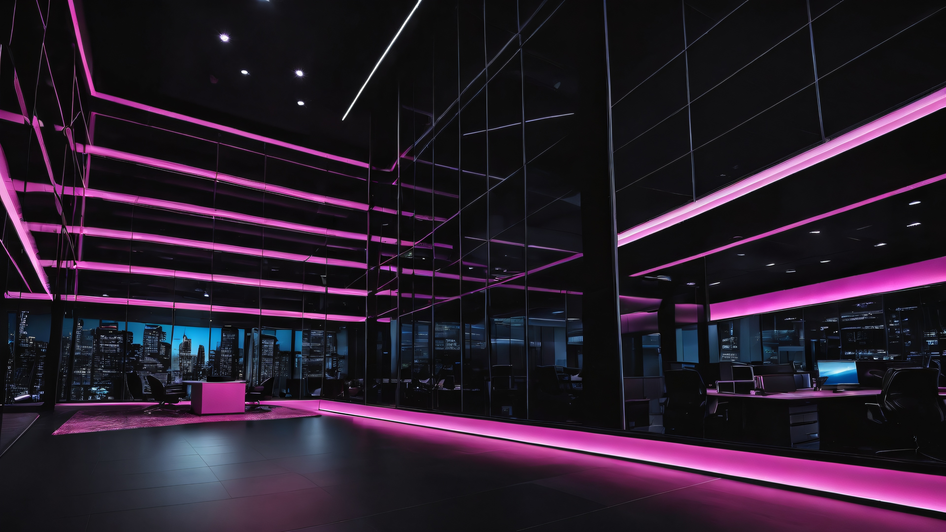 A breathtaking desktop wallpaper of office building, perfectly clean vast pure void, extreme depth of field, award-winning digital art, pristine clarity, SLEEK DARK MODE AESTHETIC. Deep perfect blacks, striking crisp contrast, and elegant luminescent accents. AVOID cinematic lighting., [‘blue’, ‘pink’, ‘neutral’], 16:9 aspect ratio, elegant low-key lighting, deep perfect blacks, striking contrast, sleek dark mode aesthetic, luminescent accents, deep rich colors, award-winning digital art, epic breathtaking scale, stunning visual impact, perfect composition, highly textured surfaces, intricate micro-details, physically based rendering, macOS wallpaper aesthetic, masterpiece, highest quality, highly detailed, 8k resolution.