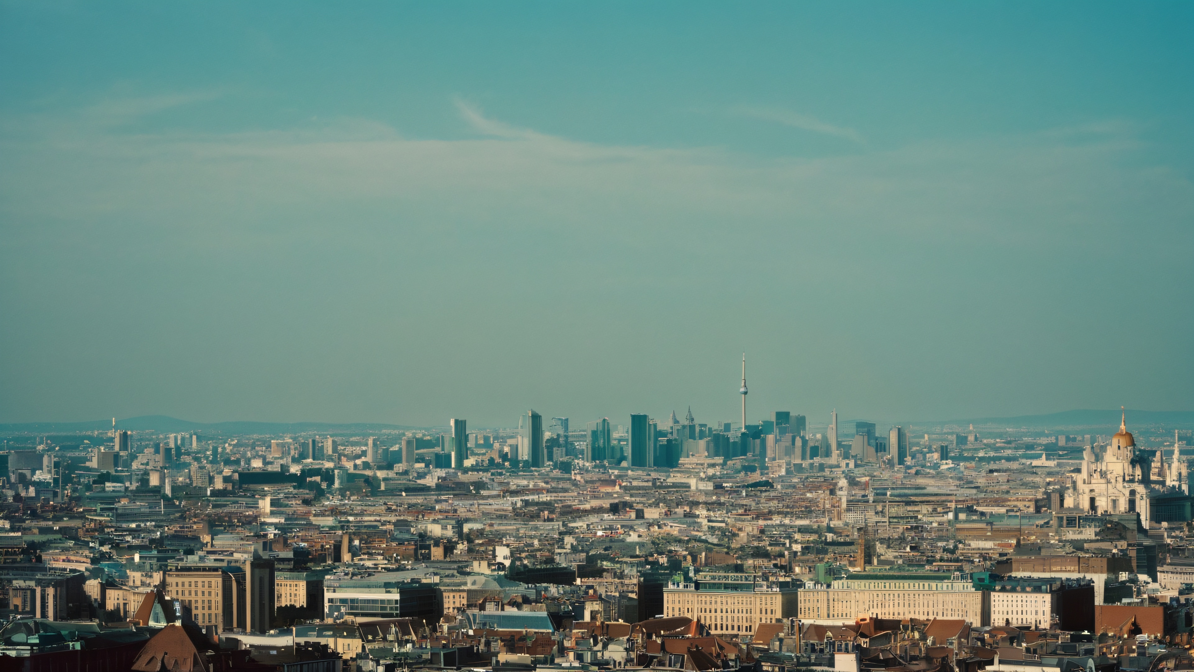 A breathtakingly stunning urban landscape unfolds with a blend of softbox and natural light, casting a moody atmosphere. The centered skyscrapers and buildings recede into the distance, creating a sense of depth and scale. Elegant negative space dominates the composition, allowing the viewer’s eye to wander and appreciate the fine art photography. Cinematic color grading adds a touch of drama, while subtle halation and organic film grain evoke a sense of physical camera imperfections.