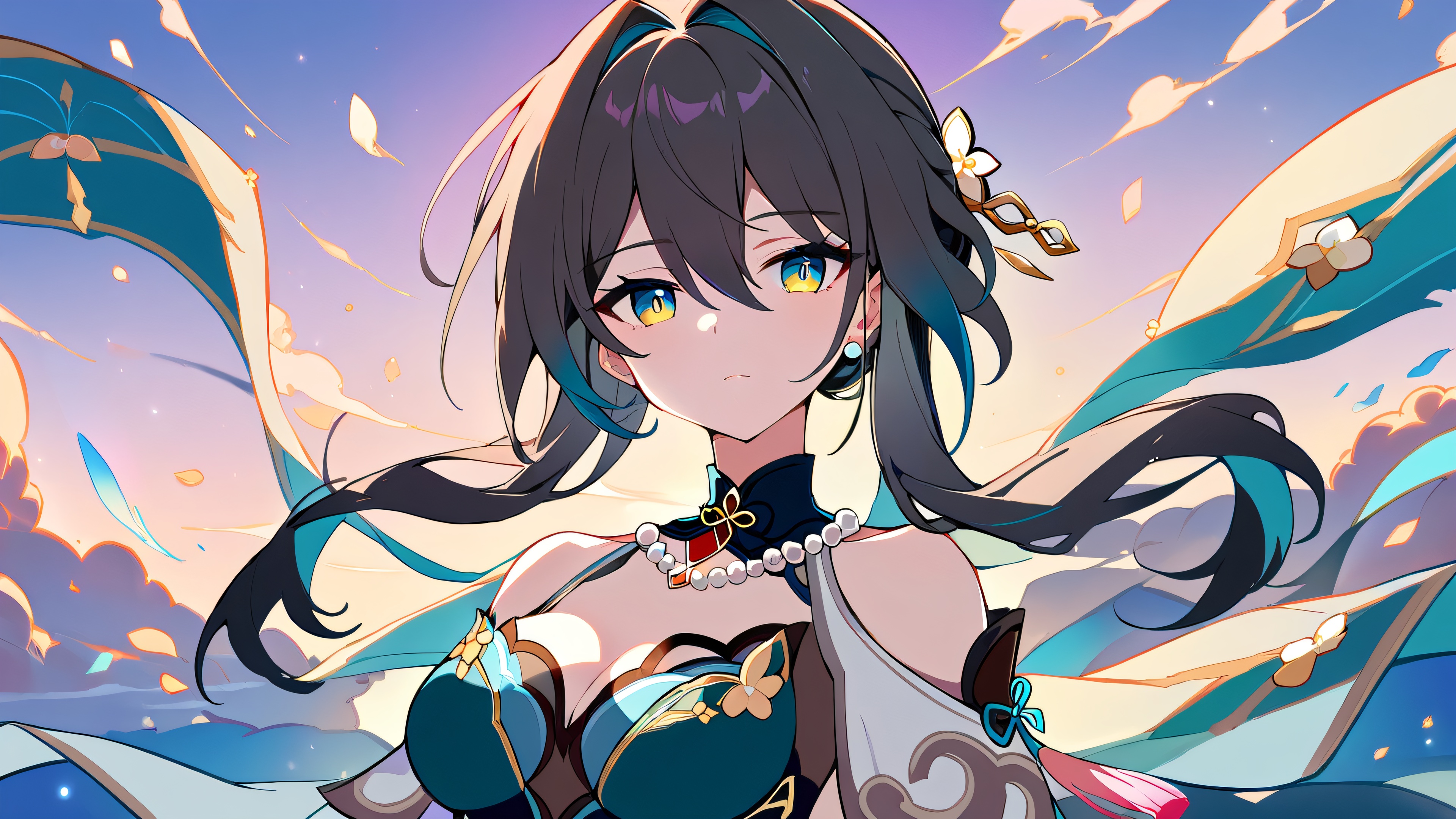 1girl, ruan mei, honkai: star rail, solo, masterpiece, best quality, very aesthetic, absurdres, highly detailed, looking at viewer, perfectly clean vast pure void, extreme depth of field, [‘orange’, ‘blue’], 16:9 aspect ratio, bright and airy, ethereal lighting, beautiful sky, cinematic lighting, vivid colors
