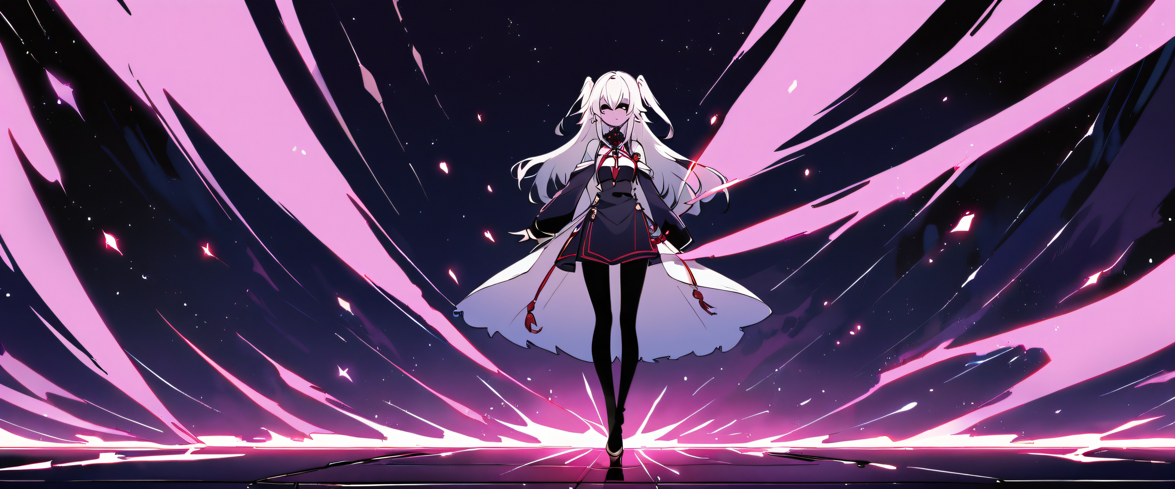 1girl, zhu yuan, zenless zone zero, solo, masterpiece, best quality, very aesthetic, absurdres, highly detailed, looking at viewer, Perfectly Clean Vast Pure Void with Extreme Depth of Field and Bokeh Effect, Soft Pastels with Dominant Pink and White Tones, 21:9 ultrawide panoramic aspect ratio, epic wide shot, elegant low-key lighting, striking contrast, deep perfect blacks, night scene, glowing lights, dramatic shadows